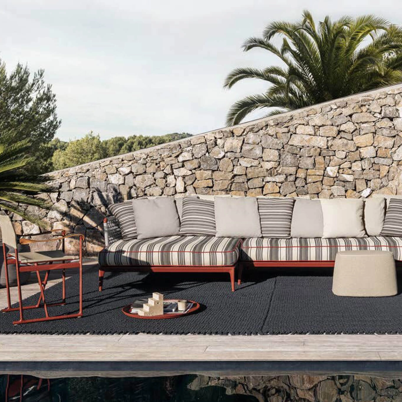 Ribes est un canapé outdoor imaginé par le designer Antonio Citterio pour la marque B&B Italia en 2019. Ce système d’assise modulaire se distingue par sa grande polyvalence, l’attention portée aux matériaux et une palette de couleurs raffinée. Sa structure repose sur un futon soutenu par des lattes flexibles en fibre de verre, monté sur un cadre en aluminium. Selon les préférences, deux styles d’accoudoirs ou de dossiers peuvent être fixés : un tressage en fibre de polypropylène ou un coussin de type traversin. L’ensemble est complété par des coussins d’assise aux allures de matelas confortables et plusieurs types de coussins de dossier et d’accoudoir, tous dotés d’un nouveau rembourrage qui confère au modèle une esthétique particulièrement chaleureuse. Adapté aux espaces intérieurs/extérieurs, le canapé outdoor Ribes s’intègre parfaitement aux vérandas, loggias, patios ombragés ou terrasses couvertes, incarnant une approche fluide et contemporaine des espaces ouverts de la maison.