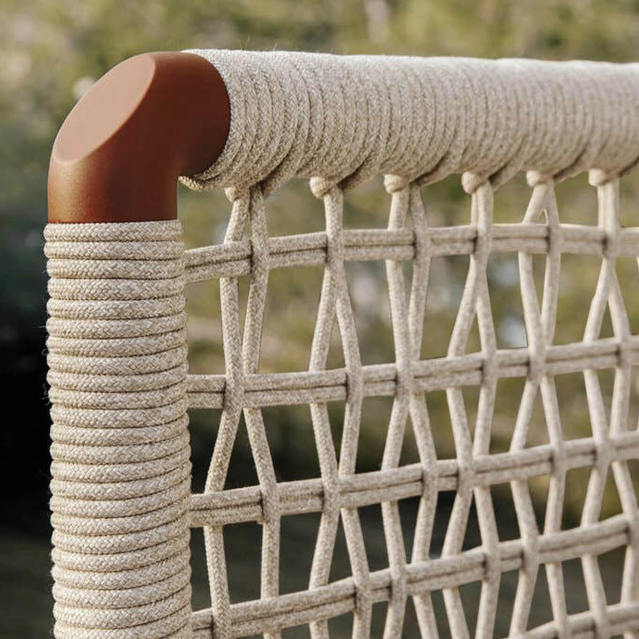 Structure aluminium verni poudre, rembourrage dossier et rouleau en fibre de plyester recyclé, tressage, lattes assise en fibre de verre
