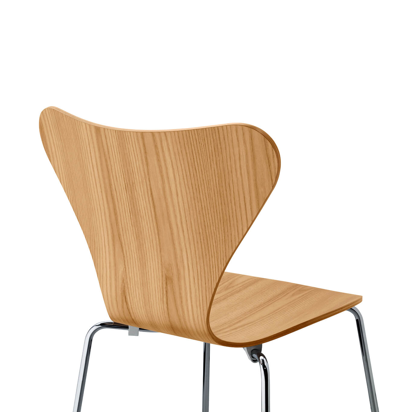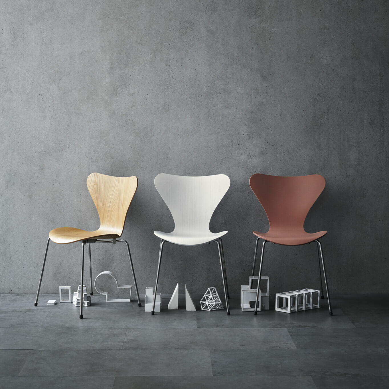 Les chaises Série 7, dessinées par Arne Jacobsen en 1955, sont de loin les chaises les plus vendues de l'histoire du fabricant Fritz Hansen. Classiques du design, elles font partie de notre quotidien. Visionnaire, Arne Jacobsen a exploité les possibilités du placage et moulage du bois déjà employé sur la chaise Fourmi en 1952, pour parvenir à la forme iconique de la Série 7. Légère et empilable, elle s'impose dans tous les espaces par sa forme douce et son confort. Sa structure chromée s'associe avec un siège en bois naturel ou frêne coloré.