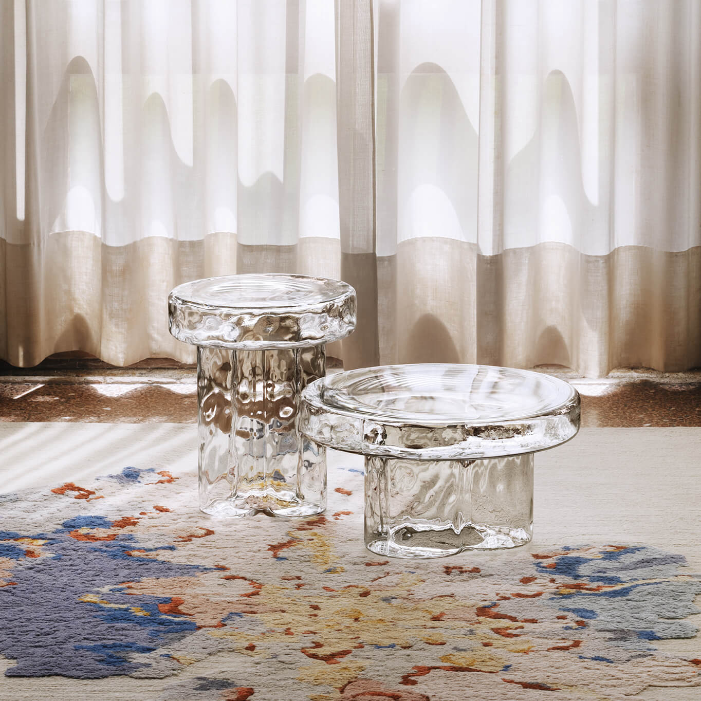 Avec Soda Iced, la célèbre table de Miniforms conserve son design iconique, mais avec une finition très visuelle. La surface extérieure reste lisse au toucher, tandis que la texture intérieure scintille, mise en valeur par la nouvelle surface transparente. Chaque table au design massif provient d’un seul volume de verre de Murano soufflé et démoulé par des maitres-verriers. Soda possède un pied unique constitué de 3 pétales qui soulèvent son plateau. Toute la matière de la table Soda résonne : sa transparence et son enveloppe martelée fragmentent et jouent avec la lumière, en lui donnant une esthétique primitive. L’allure élégante de Soda convient parfaitement à la décoration d’un salon, de préférence dans un coin éclairé de manière à le laisser sublimer la pièce par des reflets colorés. La collection Soda est disponible dans les versions table d’appoint et table basse.