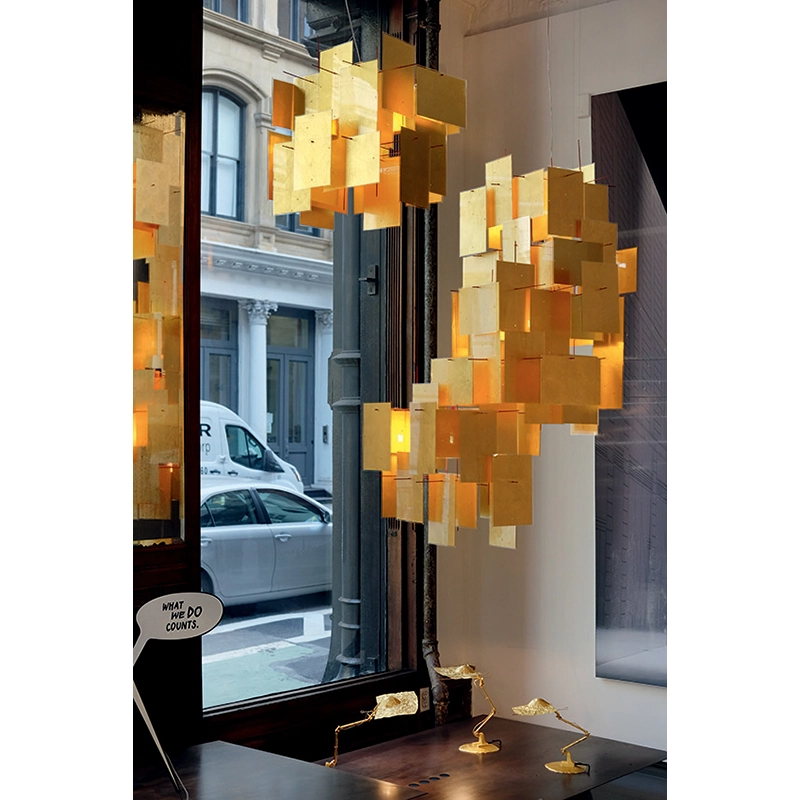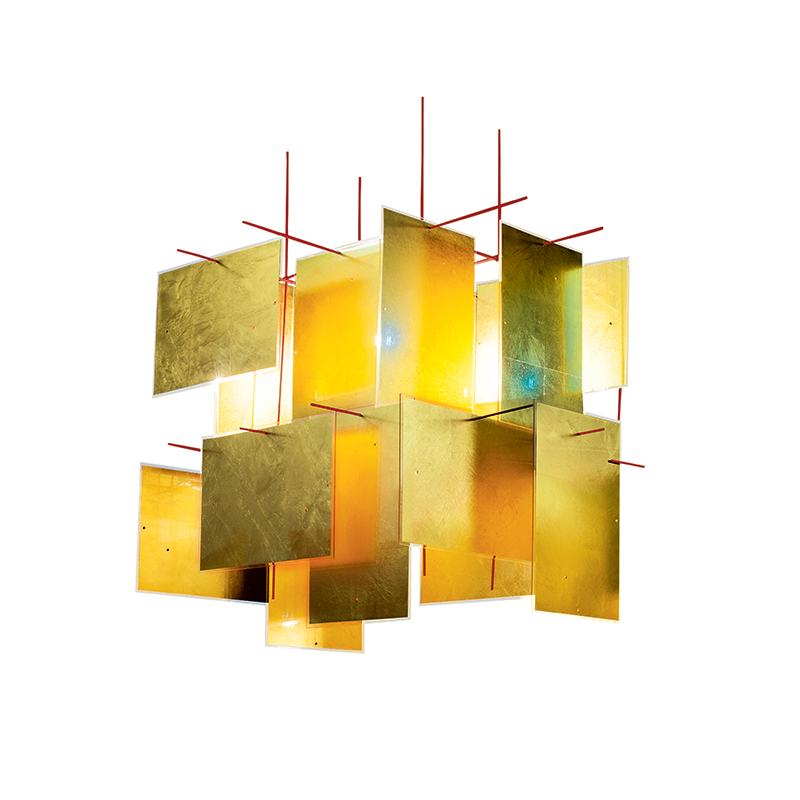 La suspension Karat Blau du designer Axel Schmid et de la marque Ingo Maurer est une pièce unique qui attire les regards. Elle est composée d'une structure en métal rouge, sur laquelle sont suspendues des plaques dorées, qui peuvent être accrochées en format portrait ou paysage, selon les goûts de chacun et ainsi créer une suspension très personnelle. Chaque écran en or de 1000 Karat Blau est produit au Japon individuellement et à la main. La très fine feuille d'or est ensuite coulée dans des plaques en acrylique selon un procédé unique. Grâce à la technique de frappe spéciale de l'or, la feuille d'or très fine présente un magnifique motif en forme d'étoile. Les couleurs rouge des tiges et bleue du point lumineux fournissent un superbe contraste avec l'or. Les suspensions Karat Blau d’Ingo Maurer sont des pièces maitresses qui garantissent élégance et fascination.