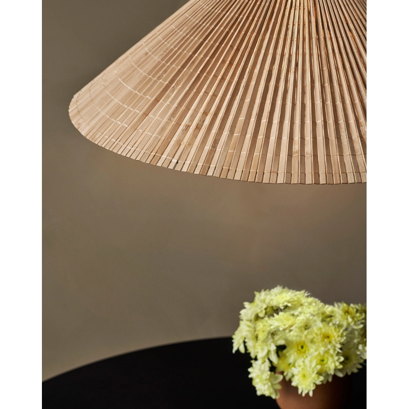 Créée par le célèbre designer Paavo Tynell, la suspension 1972 se caractérise par son abat-jour conique en bambou, produit par des maitres artisans. Les lattes de bambou sont cousues ensemble pour former une surface plissée, qui est ensuite cousue à la main sur une doublure en lin, et fixée sur une structure en fil de fer. La lumière est dirigée vers le bas et crée une lueur diffuse autour de l'abat-jour et vers le haut, la lumière passant à travers les lattes de bambou. Les détails en laiton de la suspension 1972 Gubi ajoutent une touche d’intemporalité et complètent parfaitement le ton chaud du bois et de la lumière. Sous l’ampoule, un diffuseur en tissu module la lumière.