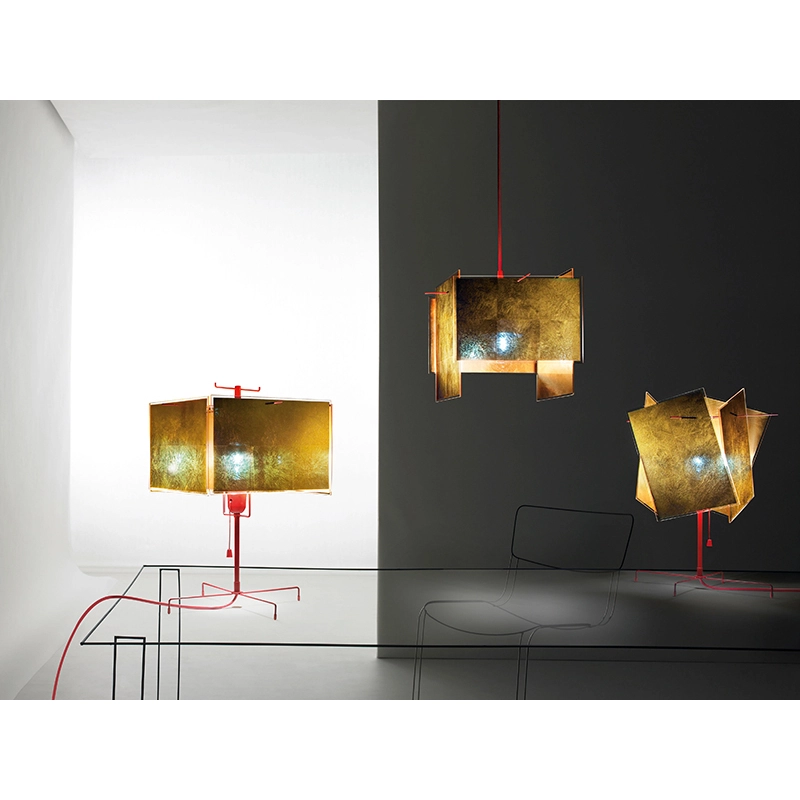 La suspension Karat Blau du designer Axel Schmid et de la marque Ingo Maurer est une pièce unique qui attire les regards. Elle est composée d'une structure en métal rouge, sur laquelle sont suspendues quatre plaques dorées, qui peuvent être accrochées en format portrait ou paysage, selon les goûts de chacun et ainsi créer une suspension très personnelle. Chaque écran en or de 24 Karat Blau est produit au Japon individuellement et à la main. La très fine feuille d'or est ensuite coulée dans des plaques en acrylique selon un procédé unique. Grâce à la technique de frappe spéciale de l'or, la feuille d'or très fine présente un magnifique motif en forme d'étoile. Les couleurs rouge des tiges et bleue du point lumineux fournissent un superbe contraste avec l'or. Les suspensions Karat Blau d’Ingo Maurer sont des pièces maitresses qui garantissent élégance et fascination.
