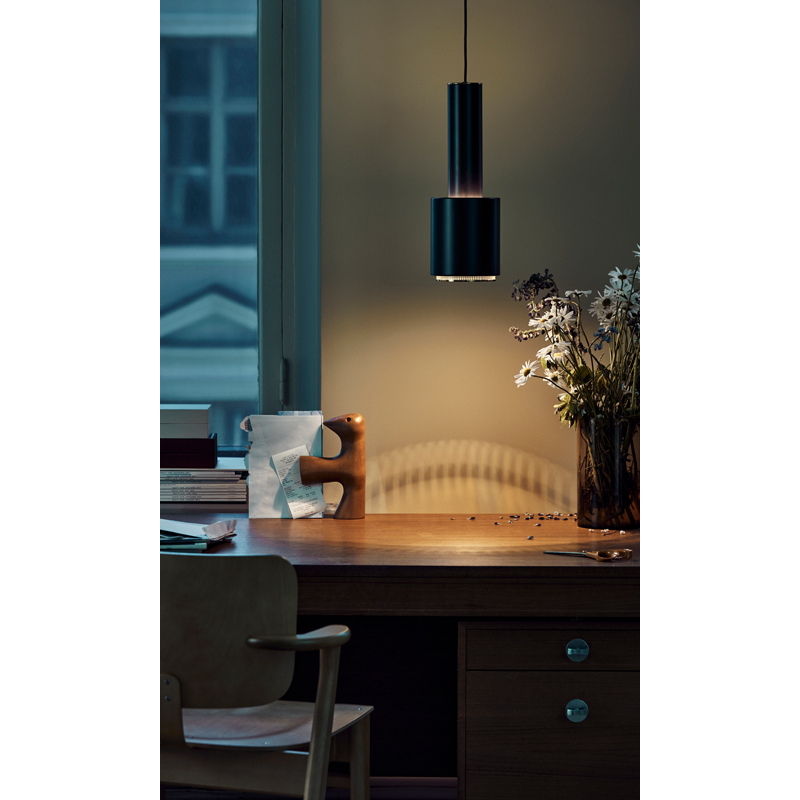 Cette élégante suspension est surnommée « Hand Grenade » pour sa forme distinctive. Composée d'un abat-jour en acier laqué et d'un anneau intérieur, la suspension A110 offre une exceptionnelle qualité de lumière aux tons chauds. "Hand Grenade" projette une lumière directe et indirecte sur les plafonds, et son anneau intérieur perforé crée un effet de halo autour de la suspension tout en réduisant simultanément l'éblouissement. « Hand Grenade  » a été conçue pour le bâtiment Alvar Aalto créé pour l'Association des ingénieurs finlandais.