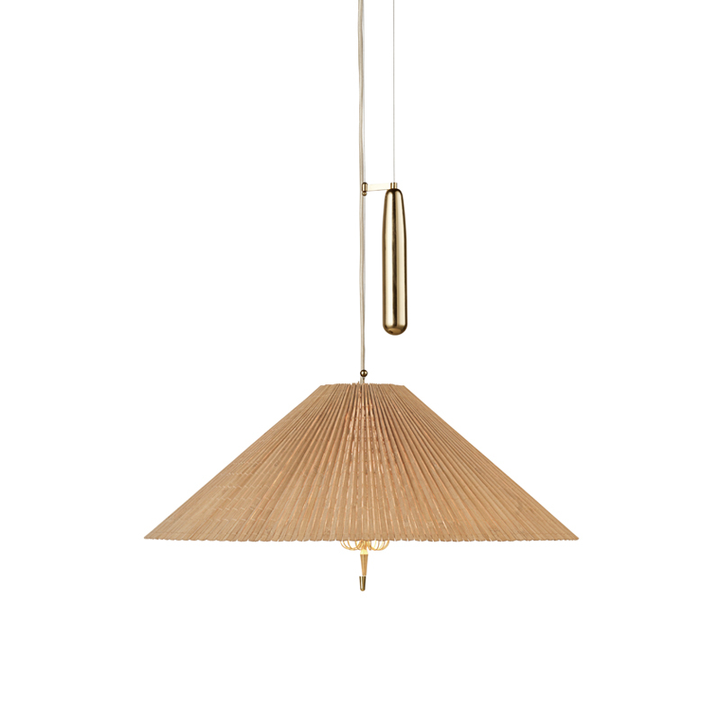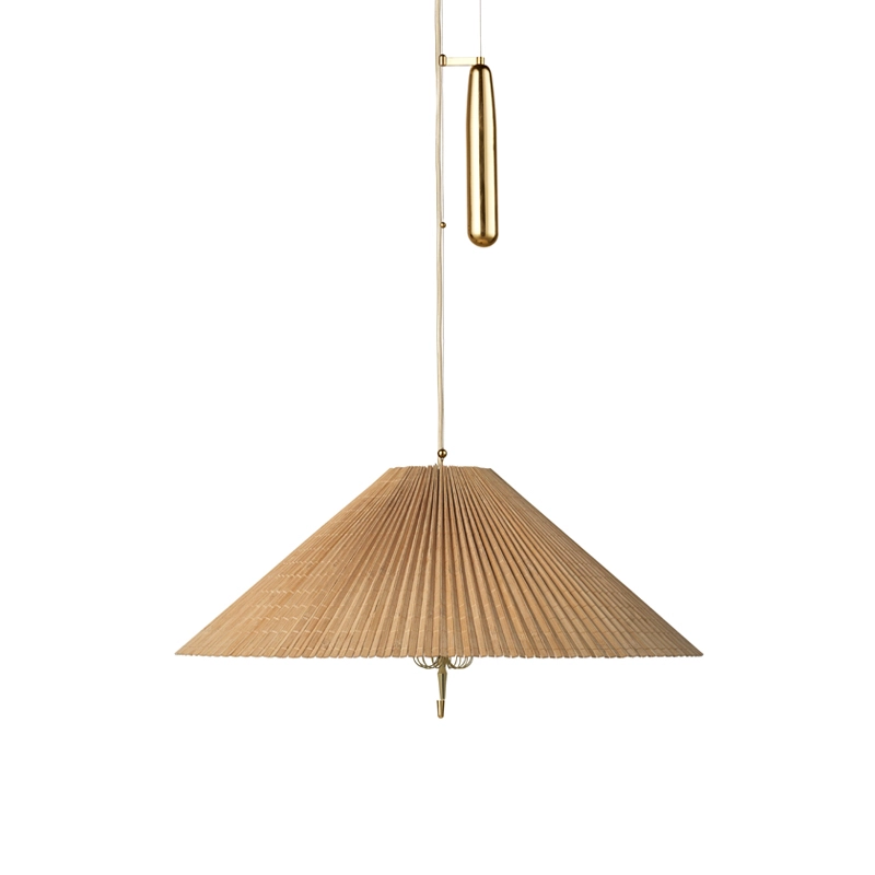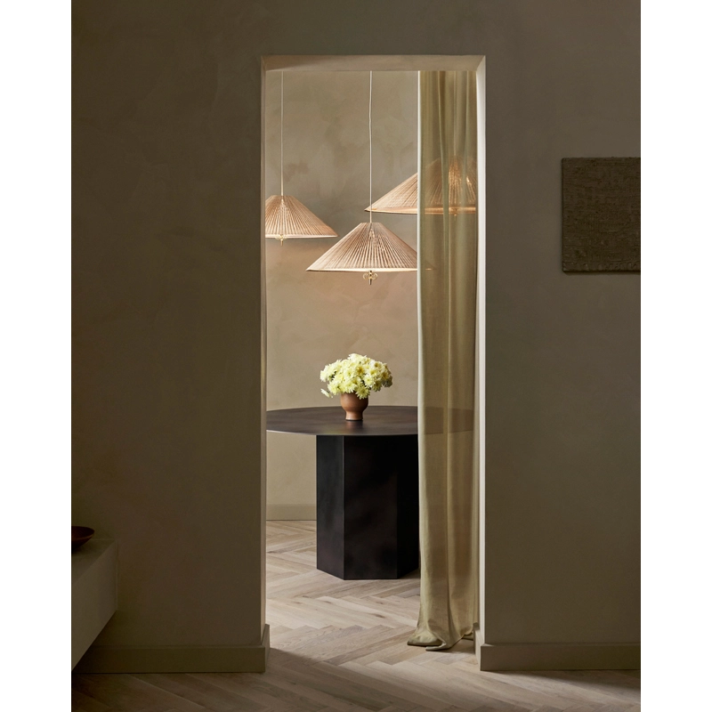 Créée par le célèbre designer Paavo Tynell, la suspension 1972 se caractérise par son abat-jour conique en bambou, produit par des maitres artisans. Les lattes de bambou sont cousues ensemble pour former une surface plissée, qui est ensuite cousue à la main sur une doublure en lin, et fixée sur une structure en fil de fer. La lumière est dirigée vers le bas et crée une lueur diffuse autour de l'abat-jour et vers le haut, la lumière passant à travers les lattes de bambou. Les détails en laiton ajoutent une touche d’intemporalité et complètent parfaitement le ton chaud du bois et de la lumière. Sous l’ampoule, un diffuseur en tissu module la lumière. Editée par Gubi, la suspension A1972 est réglable en hauteur grâce à un mécanisme ingénieux imaginé par Tynell.