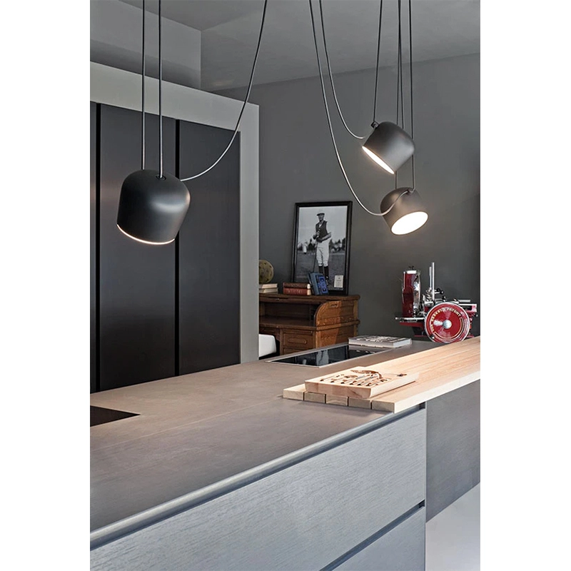 Aim est une suspension au design fort éditée par Flos qui permet de créer un éclairage précis, ou une composition de luminaires très personnelle. Les frères Bouroullec expliquent leur concept ainsi : " Nous avons élaboré la proposition d'une nouvelle typologie de lampe qui se place naturellement dans l'espace - comme le ferait une plante - grâce aux longs câbles qui facilitent librement l'orientation et la hauteur de la lumière. " Le long câble, qui fait partie intégrante du design de cette lampe, permet d'orienter le diffuseur dans tous les sens en le faisant simplement coulisser. Avec ce câble de 9 mètres, Aim peut être suspendue à plus de 3 mètres du plafond.