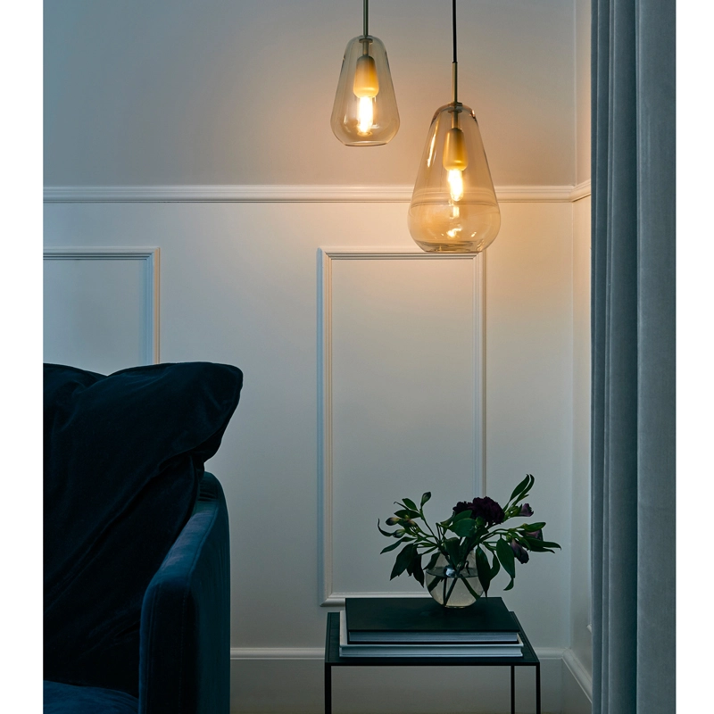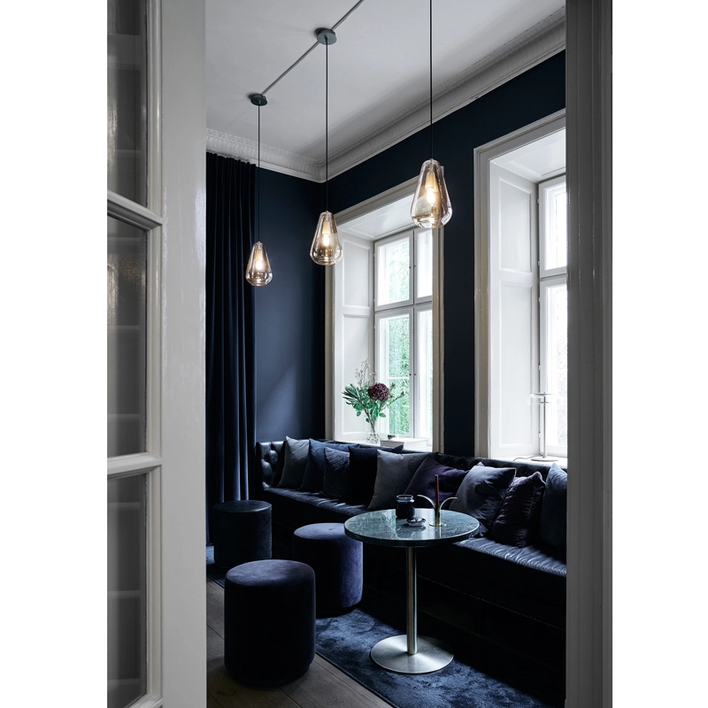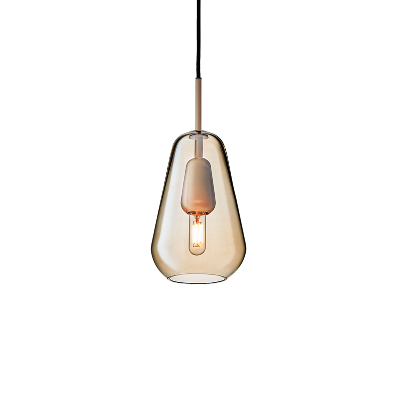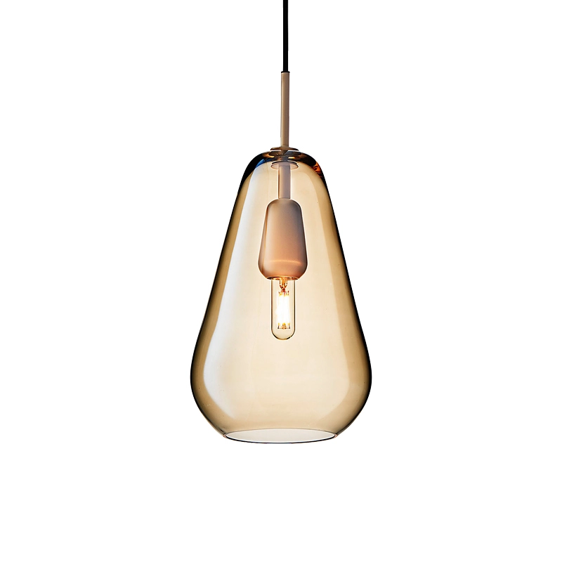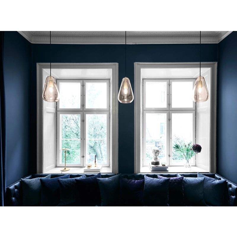 Nuura, les luminaires sont réalisés avec des matériaux de grande qualité par des artisans qualifiés. La version en verre doré souligne la forme à la fois simple et élégante de la suspension. Dans la version en verre blanc opalin,