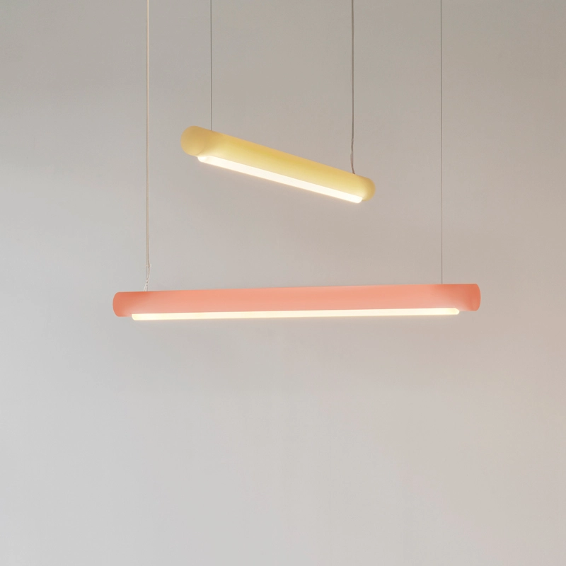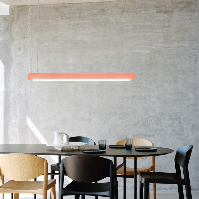 Conçue par Sabine Marcelis pour la marque Established & Sons, la suspension Aura se compose de deux éléments : un cylindre en résine bio époxy colorée dans lequel est inséré un tube de LED en verre. Grâce à son matériau translucide, Aura apporte un éclairage doux et chaleureux. Cette suspension peut être utilisée seule ou groupe pour créer une composition graphique et unique. La suspension Aura a été conçue pour fournir un éclairage agréable et non éblouissant pour les yeux, qui s'adapte aussi bien à un environnement domestique qu'à un espace collectif.