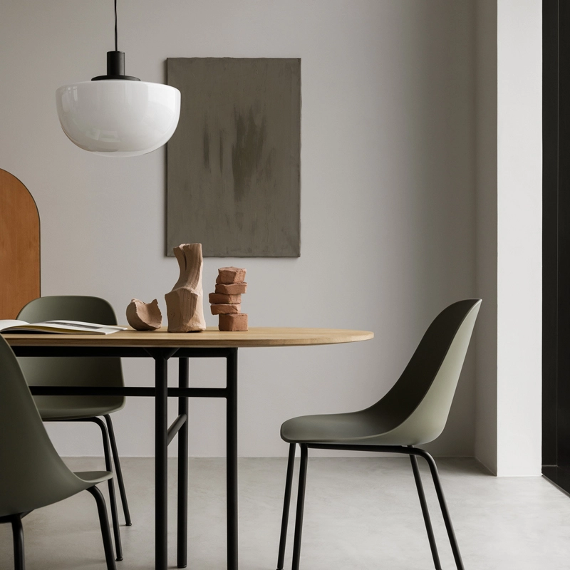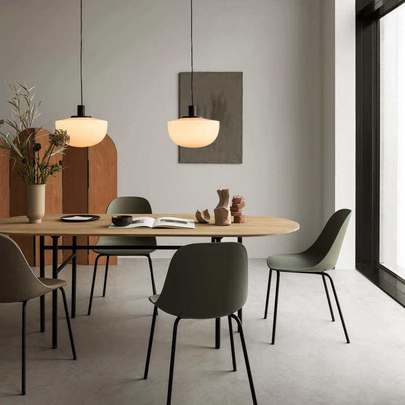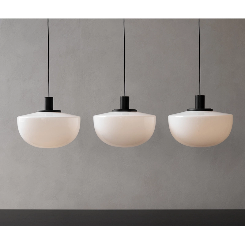 Bank est une suspension semi-circulaire réalisée en verre soufflé opalin ou fumé et associé et en aluminium finition époxy noir. Le verre opaque diffuse avec douceur une lumière à 360 degrés, créant une lumière à la fois fonctionnelle et d’ambiance. Les matériaux utilisés assurent une lampe de qualité, faite pour durer dans le temps. Les fondateurs de Norm Architects se sont inspirés d’une suspension de style vintage, repérée plusieurs fois à New York en se promenant dans le quartier financier. La forme – née dans les années 1920 – a rapidement été modernisée dans l’imagination des designers, devenant la