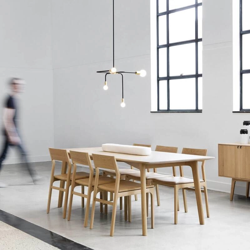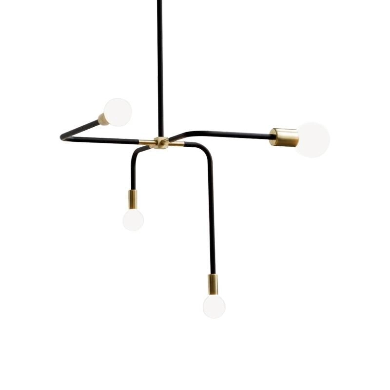 suspension Beaubien, sur ses quatre fines branches noires mattes, laisse apparaître au bout de chacune une finition en laiton qui est complétée par des ampoules en verre opalin. Interprétation moderne du lustre classique, ce luminaire se démarque par un design minimaliste et asymétrique. La tige de la
