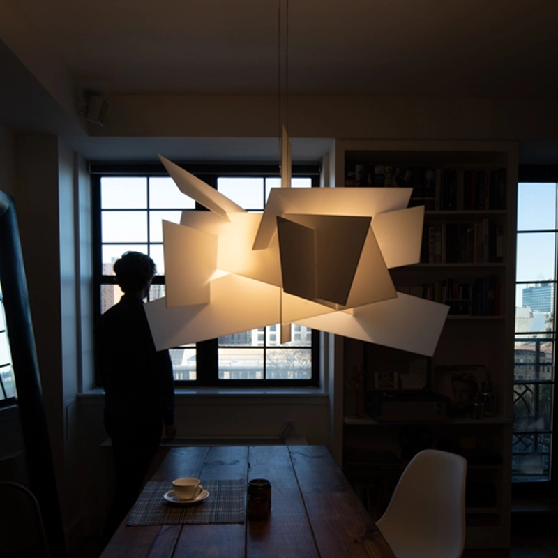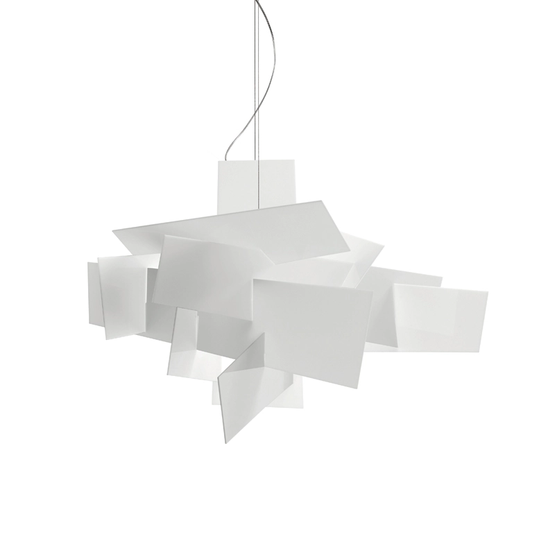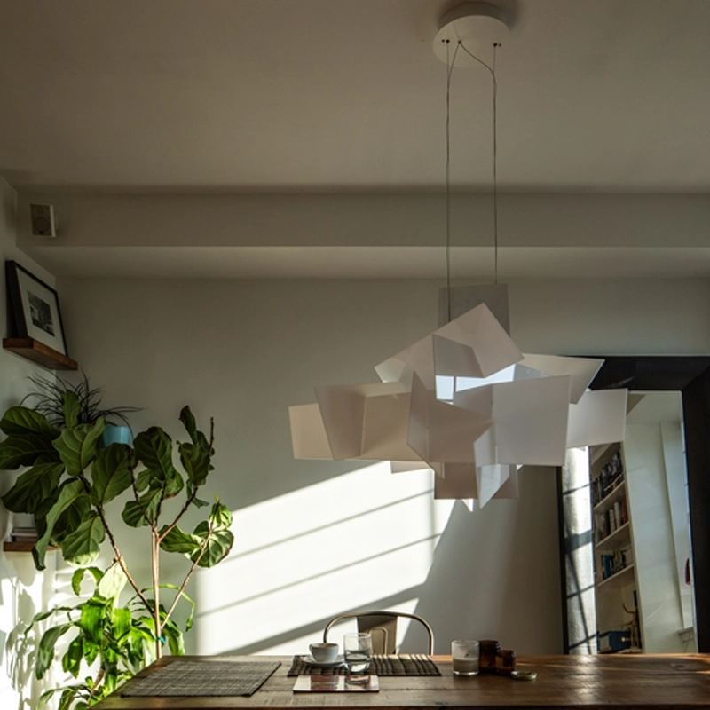 Big Bang : une suspension étonnante marquée par des intersections irrégulières et apparemment fortuites de plans dans l'espace qui créent un volume autour de la source lumineuse et définissent le caractère si dynamique de cette lampe. Telle une « explosion », les plans ? réalisés en méthacrylate semblent s'échapper du noyau lumineux central et se répercuter dans toutes les directions. Caractérisée par un jeu d'ombres et de lumières, et d'un fort impact visuel, cette suspension éditée par Foscarini est idéale pour personnaliser l'ambiance d'une pièce. Elle fournit une lumière intense, énergique et directe. Le duo de designers Enrico Franzolini et Vicente Garcia Jimenez ont joué sur la disposition particulière des plans pour garantir une réflexion maximum et en même temps éviter l'éblouissement. Un subtil travail qui s'intègre dans le salon, le couloir ou l'entrée.