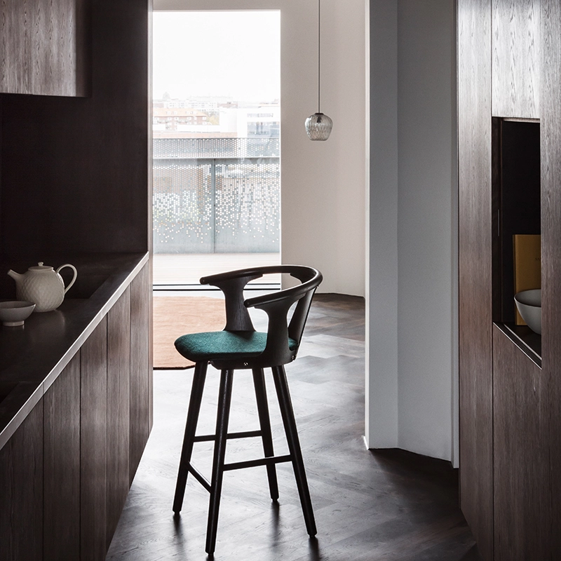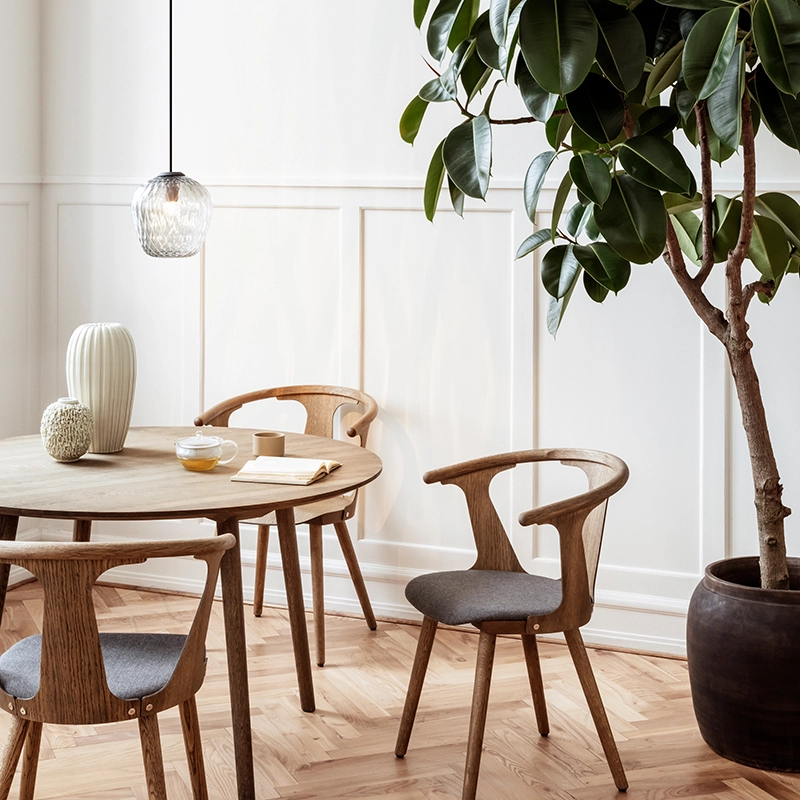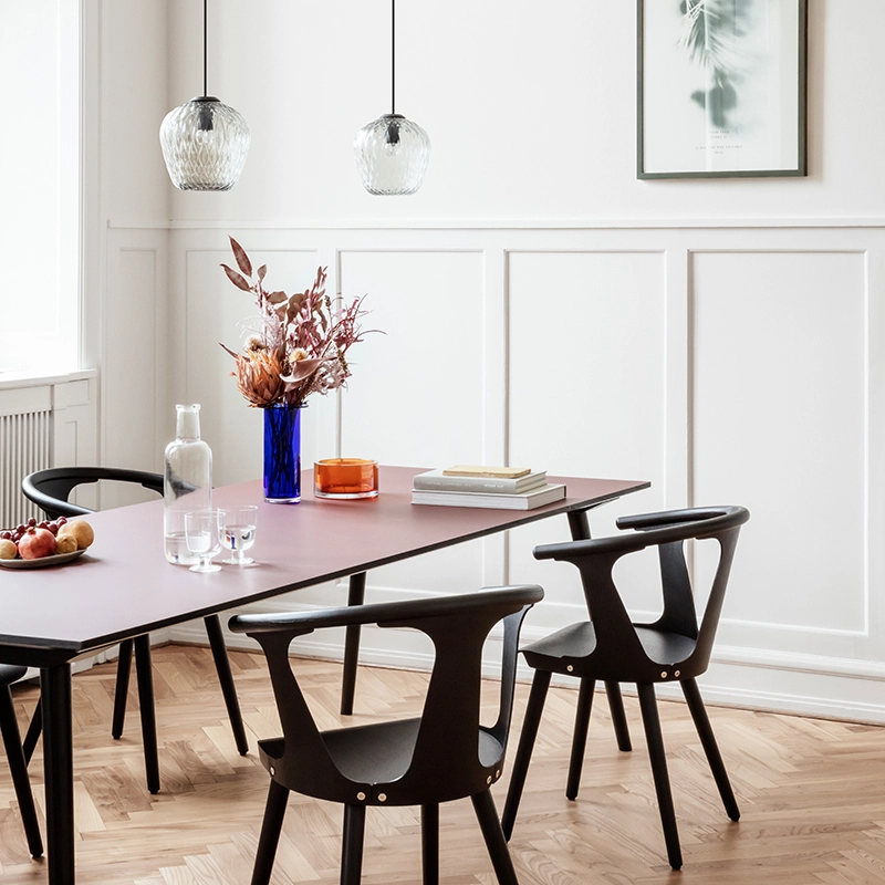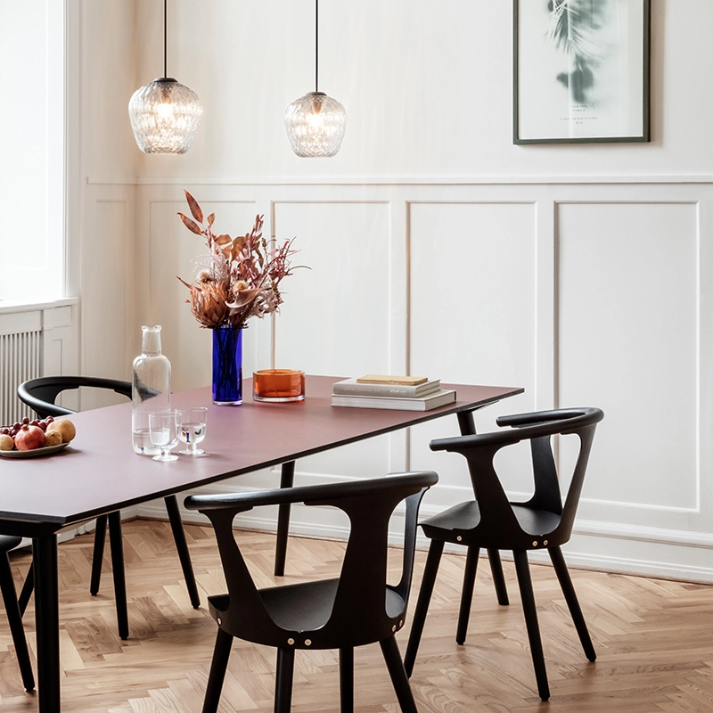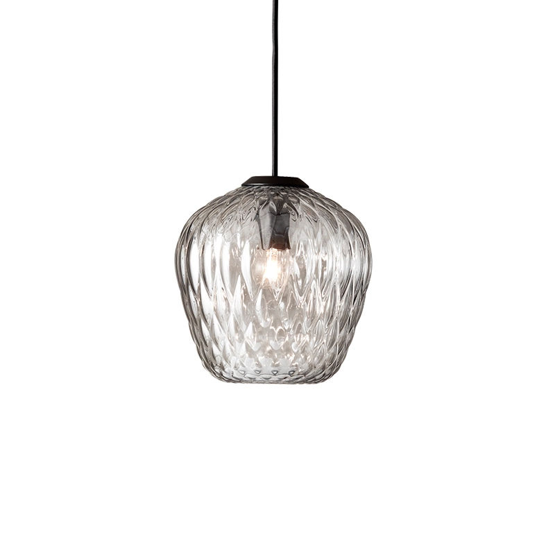 And Tradition combine des procédés industriels associés au travail artisanal des maîtres verriers. La texture du verre est créée avec une aide informatique pour contrôler de façon précise la taille de chaque bulle. La forme est déterminée par un moulage puis soufflée à la main. C'est une suspension qui se suffit à elle-même, mais fonctionne aussi très bien en grappe au dessus d'une table de salle à manger par exemple. La version sablée apporte une lumière subtile et sophistiquée, tandis que la version transparente transforme l'espace et l'habite avec la projection de ses motifs.