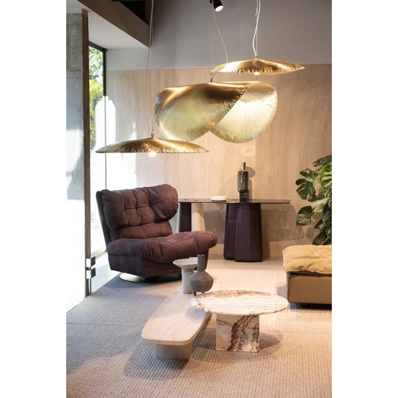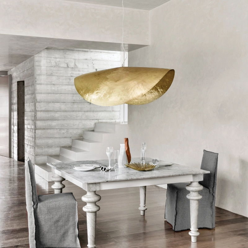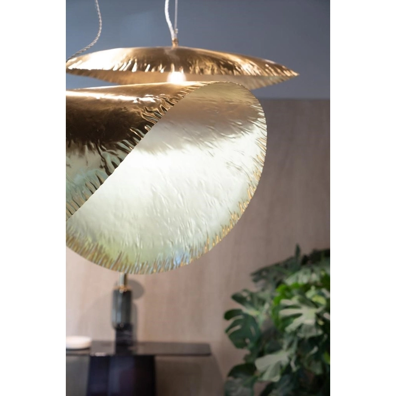 Eteinte, la surface en laiton martelé de la suspension Brass 96 joue avec la lumière extérieure. Lorsqu'elle est allumée, elle reflète la lumière électrique de l'intérieur, créant une ambiance vibrante, vivante, apaisante et chaleureuse. La suspension Brass 96 de Gervasoni décore à merveille toute les pièces de la maison, de la cuisine, à la salle à manger en passant par la chambre. Edité par Gervasoni, ce luminaire impressionnant se décline en deux modèles : Brass 95 et Brass 96.