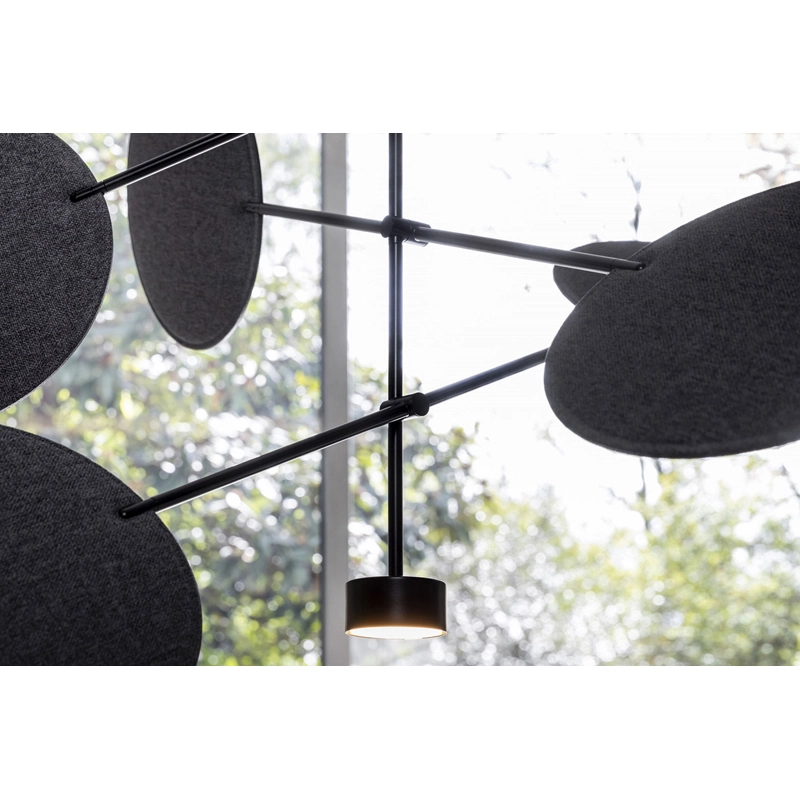 Diva est une suspension imaginée et créée par le designer Sebastiano Tosi pour Mogg. Ce luminaire raffiné se compose d’une armature en laiton dont les bras orientables soutiennent des disques réglables en tissu insonorisant. Les faisceaux de Diva se propagent depuis une source LED, pour un éclairage précis et délicat.