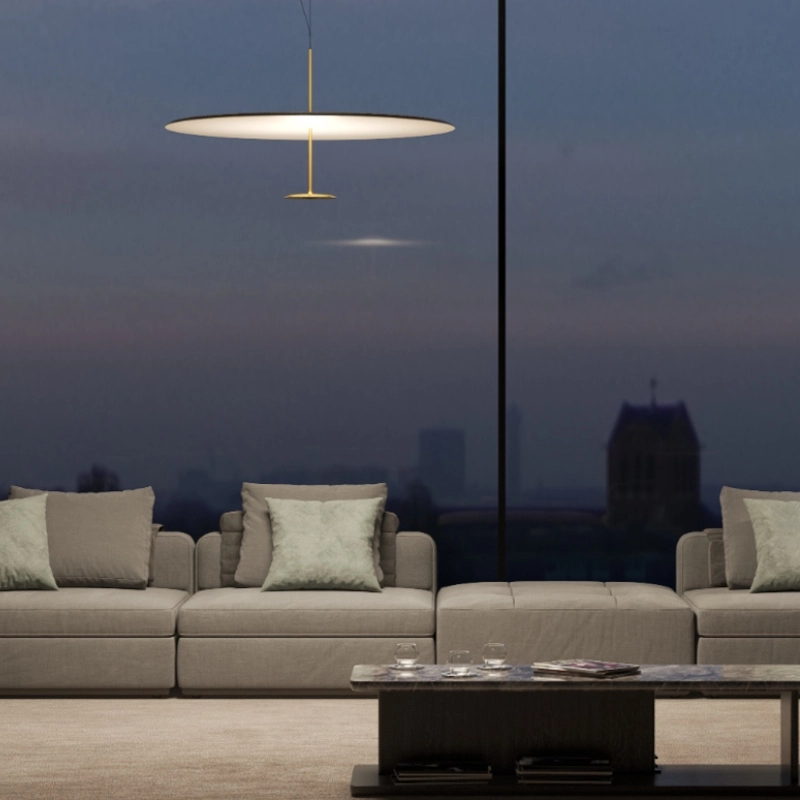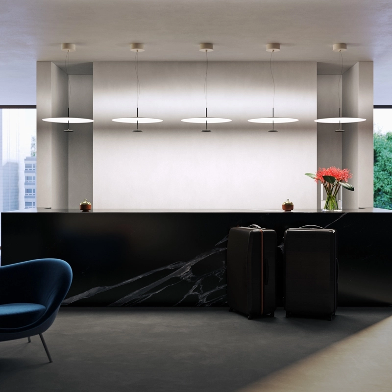 Editée par Lumina, DOT est une suspension minimaliste qui ressemble à un disque de lumière flottant. C'est un assemblage de deux disques parallèles reliés par une tige métallique. Le réflecteur a une finition blanche super «mat» , tandis que le disque plus petit contient un anneau de LED qui réfléchit la lumière vers le disque réflecteur plus grand. Un “heat pipe” étudié sur mesure transfère la chaleur de la source lumineuse vers le dissipateur de chaleur caché dans le réflecteur. Dot présente une approche innovante en matière de technologie de lentille et de dissipation de chaleur. Au-dessus d’une table de repas ou d’un bar, la suspension Dot peut être utilisée seule ou en composition de plusieurs éléments.