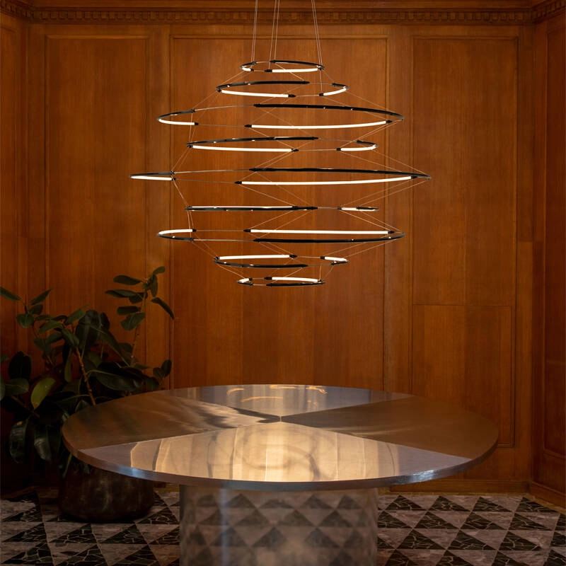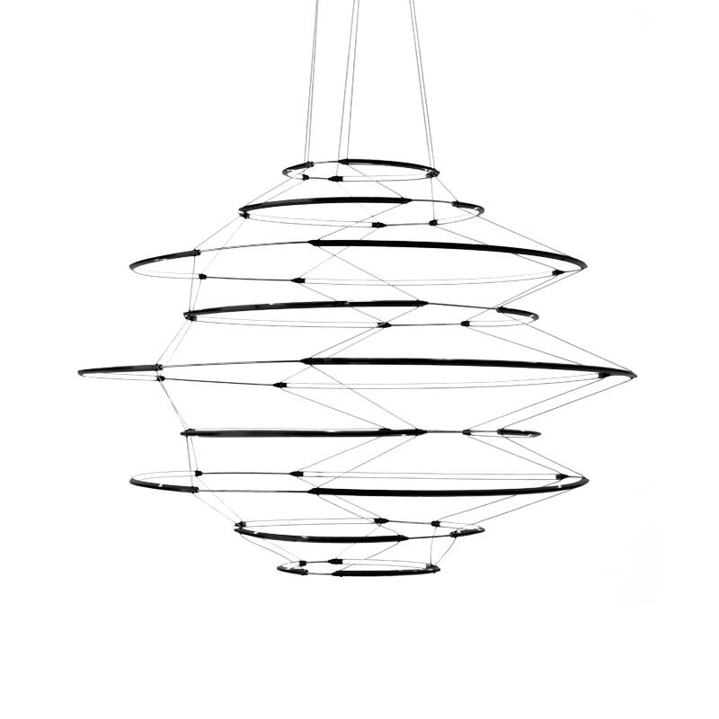 Fruit de recherches développées sur la sophistication et l’ingénierie d’éclairage, la suspension Drop 9, d’Arihiro Miyake éditée par Nemo, se présente comme une réinterprétation contemporaine et minimaliste du lustre classique. Le design du luminaire Drop 9 se veut simple et léger, sans pour autant mettre de côté la fonctionnalité d’un éclairage de qualité : la géométrie aérienne des sources lumineuses est soulignée par une fine armature en aluminium, et propage dans l’espace une lumière intense et diffuse. Les généreuses dimensions de la suspension Drop 9 font d’elle le lustre idéal pour la décoration de toutes les pièces de réception, en leur apportant élégance, finesse et légèreté.