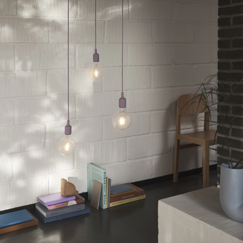 E27 est une suspension créée par Mattias Stahlbom. Le designer met l'ampoule à nue montrant la beauté pure de cette lampe de 12,5cm de diamètre. Le cordon électrique, se faisant discret habituellement, est ici mis en avant. Editée par Muuto, l'ampoule E27 se décline en un large choix de couleurs : rouge, jaune, bleu, gris, violet, noir, dans les couleurs pastel du printemps : rose, vert clair et gris clair. E27 est désormais disponible en orange. Dans le cas d'une commande de plusieurs suspensions, il est fortement recommandé de commander également la rosace multiple adaptée.