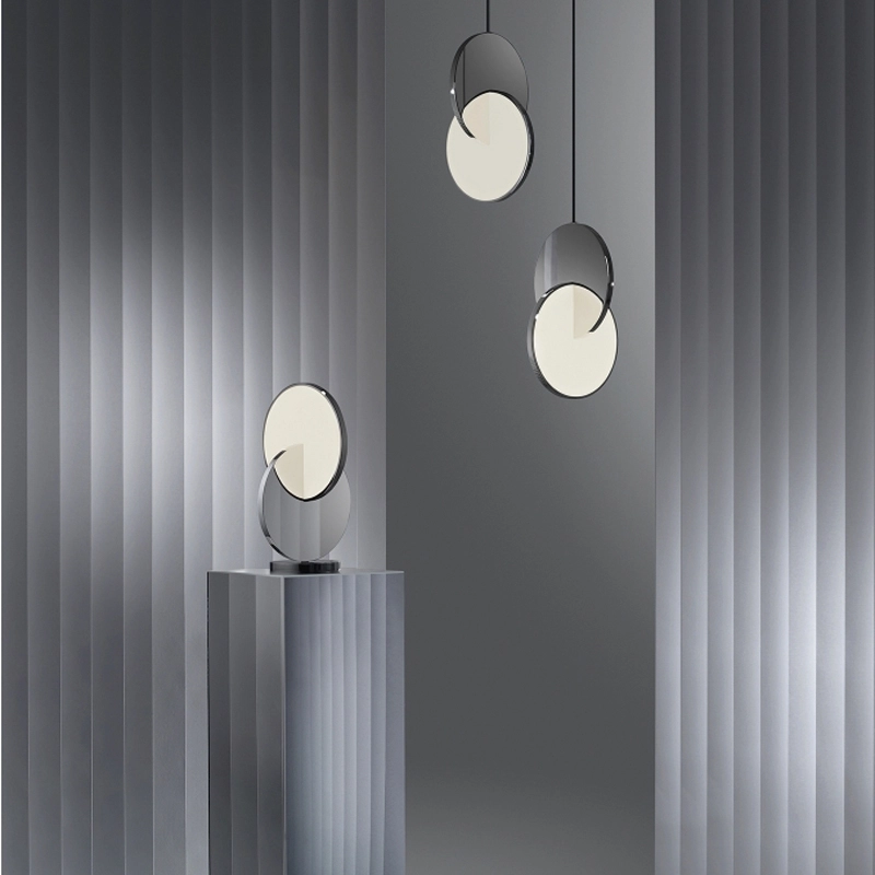 Dessinée par Lee Broom, Eclipse est céleste aussi bien dans son nom que dans son inspiration. Cette collection de luminaires est composée de disques en acier finition chrome ou laiton et en acrylique qui interagissent ensemble, éclipsent et révèlent en même temps son illumination. Eclipse est disponible en version suspension, lampe de table ou applique. Elle est dotée d’une silhouette sculpturale et change d’apparence sous tous les angles, un peu comme un mobile. Utilisant les propriétés réfractrices d’un diffuseur en acrylique et d’un système LED intégré qui crée un halo diffus, le design met en valeur le savoir-faire et l’innovation technique de Lee Broom avec sa signature, mélange entre classicisme et modernité.