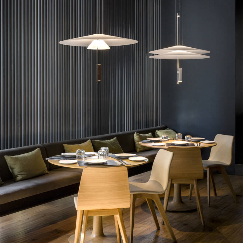 La suspension Flamingo, œuvre du designer Antoni Arola éditée par Vibia, évoque magnifiquement les qualités à la fois poétiques et sculpturales de la lumière.