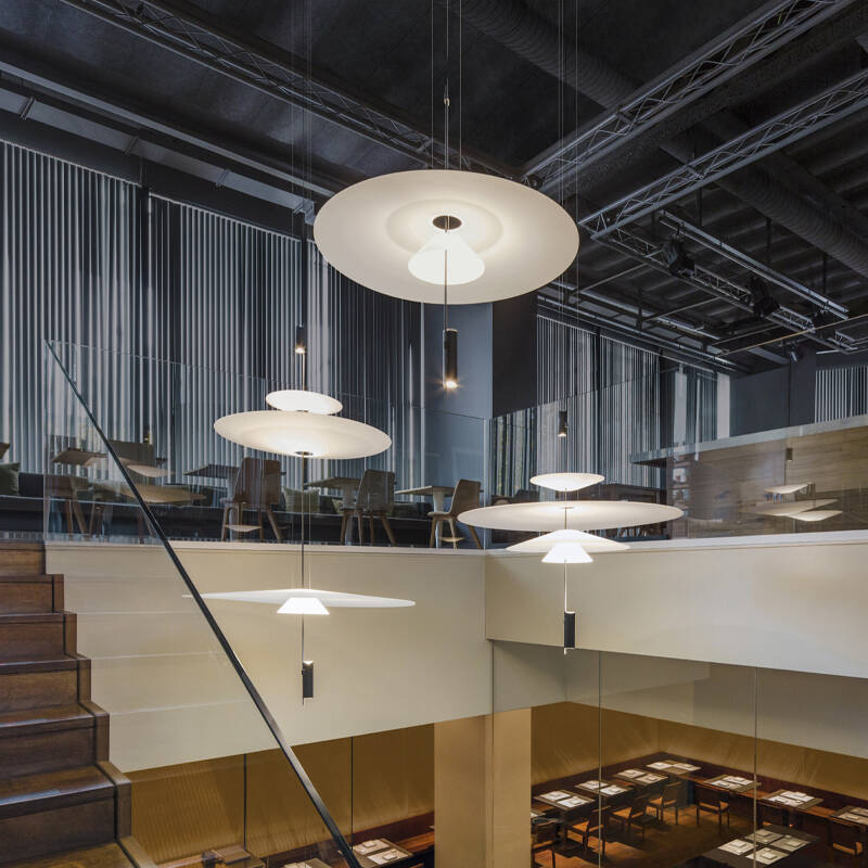 La suspension Flamingo, œuvre du designer Antoni Arola éditée par Vibia, évoque magnifiquement les qualités à la fois poétiques et sculpturales de la lumière.