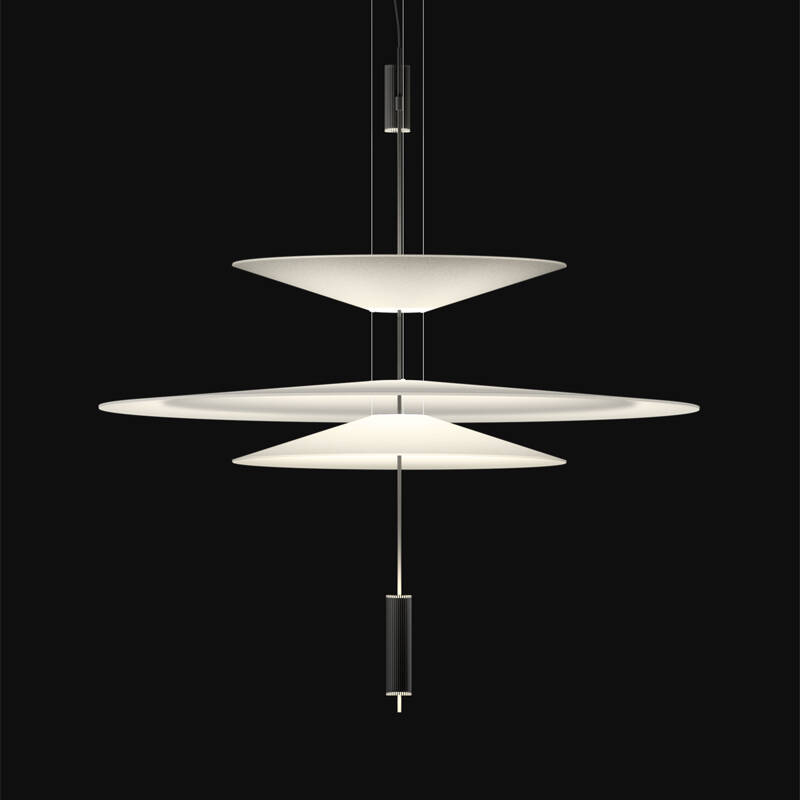 La suspension Flamingo, œuvre du designer Antoni Arola éditée par Vibia, évoque magnifiquement les qualités à la fois poétiques et sculpturales de la lumière.