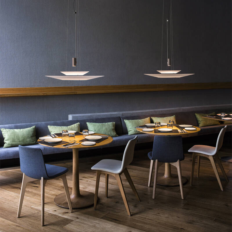 Avec sa source de lumière séparée du diffuseur – qui se compose d’une série d’anneaux concentriques et coniques retenus par de fins câbles métalliques – la lampe Flamingo permet à la fois un éclairage d’ambiance indirect dans les espaces partagés et un éclairage direct au-dessus d’une table ou d’autres surfaces.