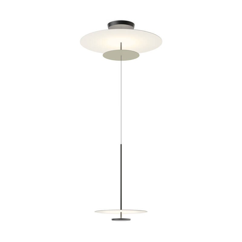 Les suspensions et plafonniers sont disponibles avec deux ou quatre disques de taille moyenne ou plus petite. Déployés en tandem, les plus petits disques se complètent pour capter et renvoyer la lumière sur les plus grands, créant ainsi des bulles de lumière douce et diffuse.
