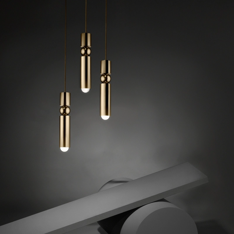 Imaginée et éditée par le talentueux Lee Broom, Fulcrum est une suspension fine et élégante. Telle une sculpture minimaliste, elle composée de deux cylindres réunis par une sphère centrale. L'ampoule visible imite symétriquement la silhouette de la sphère. Déclinée en version chrome, laiton et noir mat, Fulcrum est également disponible en lustre composé de 5 pièces.
