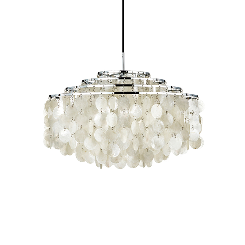Beaucoup considèrent la collection Fun comme l'un des plus grands chefs-d'œuvre de Verner Panton dans le domaine de la conception d'éclairage. Depuis 1964, cette suspension suscite la joie et une richesse d'histoires. Composée de dizaines de disques coquillage, suspendus à une structure métallique à 4 anneaux, le suspension Fun 10DM Verpan saura illuminer avec élégance votre intérieur.