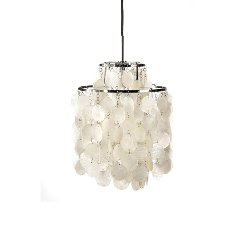 Beaucoup considèrent la collection Fun comme l'un des plus grands chefs-d'œuvre de Verner Panton dans le domaine de la conception d'éclairage. Depuis 1964, cette suspension suscite la joie et une richesse d'histoires. Composée de dizaines de disques coquillage, suspendus à une structure métallique à 2 anneaux, le suspension Fun 2DM Verpan saura illuminer avec élégance votre intérieur.
