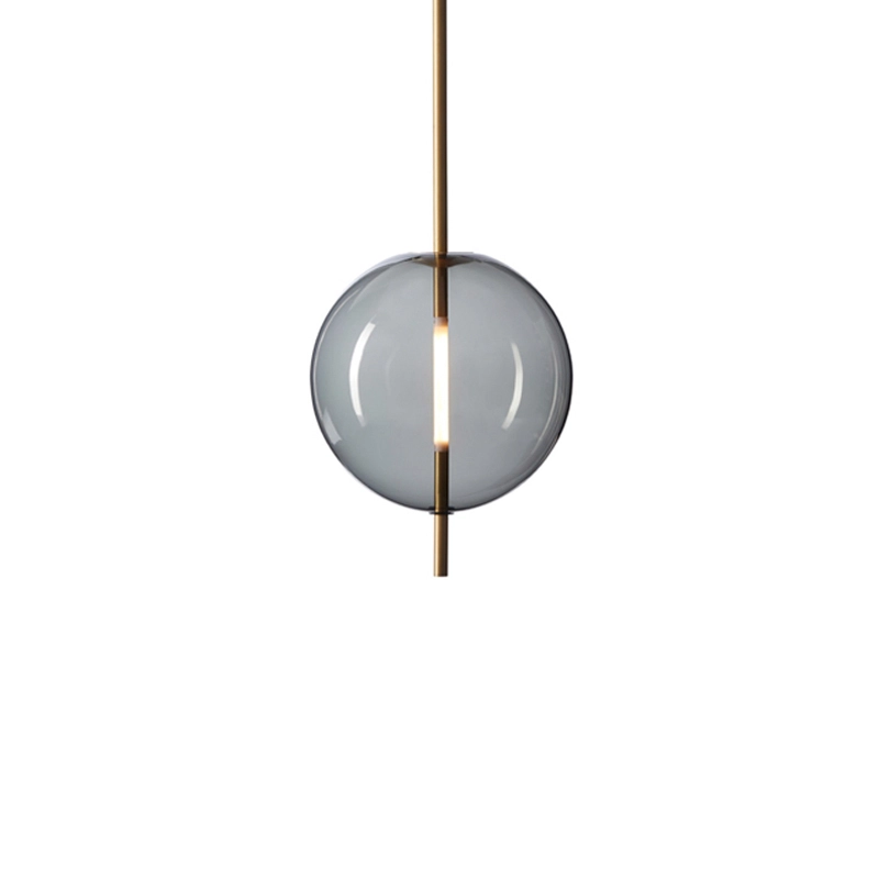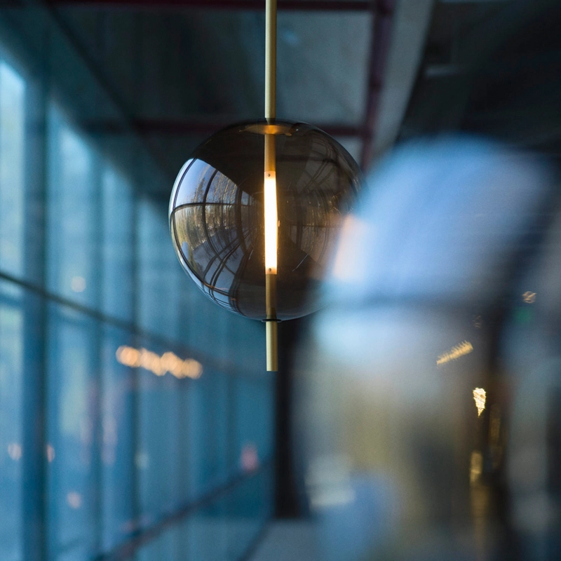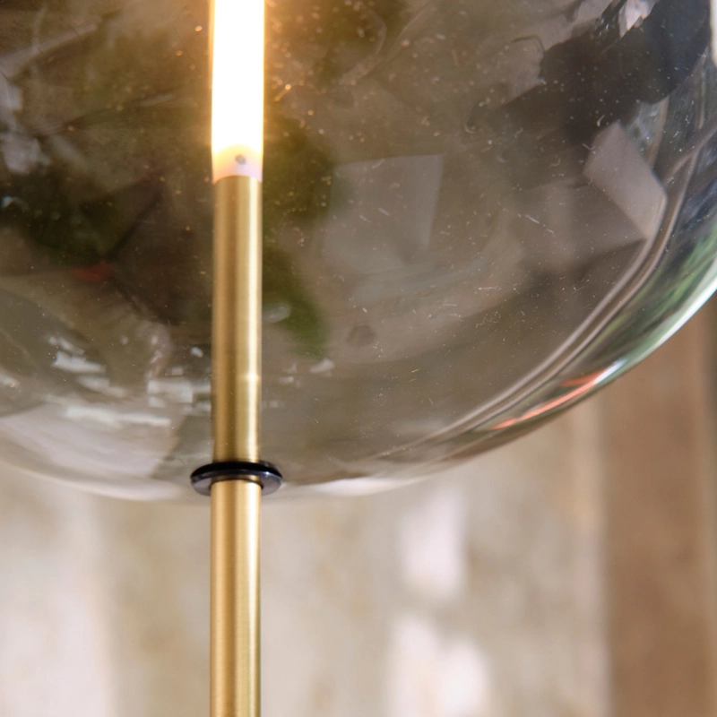 La source lumineuse sur mesure est formée et adaptée de manière transparente dans la sphère en verre. Emettant sa lueur à partir du centre de la sphère, la lampe peut être adaptée à un variateur pour créer l'ambiance voulue dans l'espace.