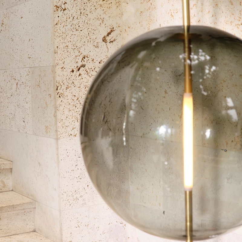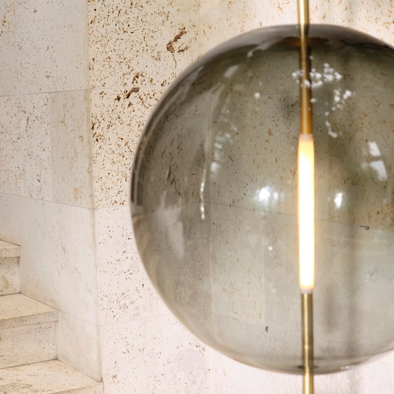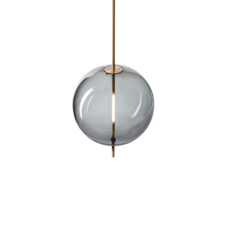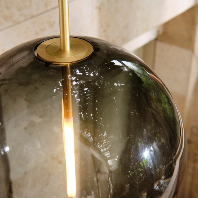La source lumineuse sur mesure est formée et adaptée de manière transparente dans la sphère en verre. Emettant sa lueur à partir du centre de la sphère, la lampe peut être adaptée à un variateur pour créer l'ambiance voulue dans l'espace.