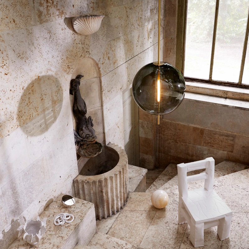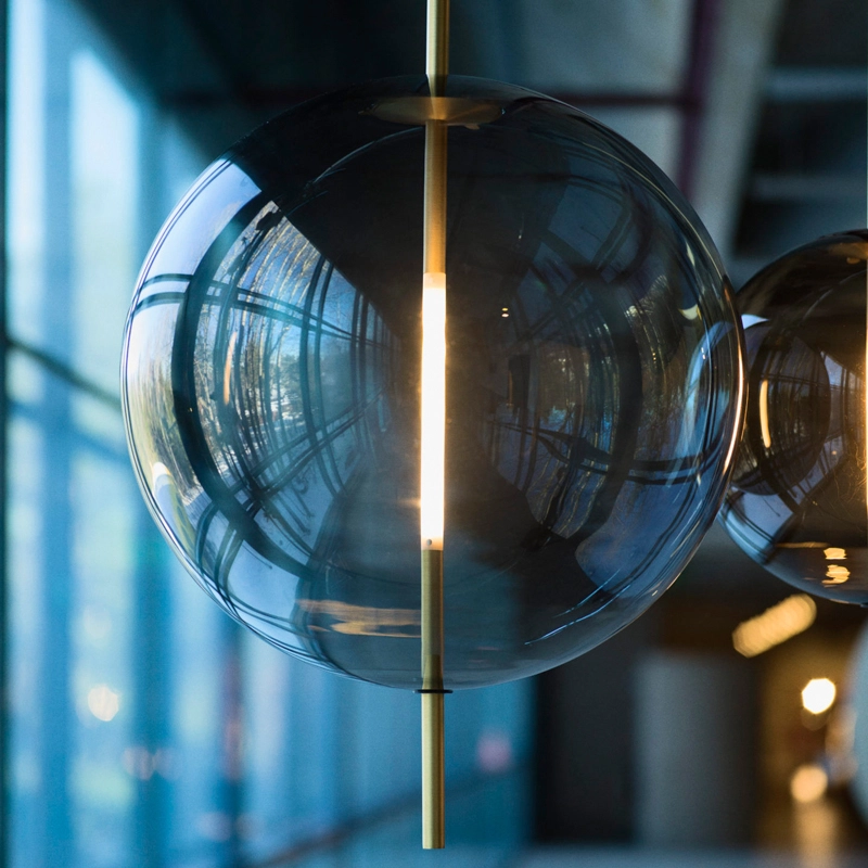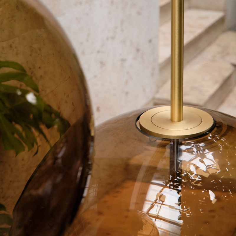 La source lumineuse sur mesure est formée et adaptée de manière transparente dans la sphère en verre. Emettant sa lueur à partir du centre de la sphère, la lampe peut être adaptée à un variateur pour créer l'ambiance voulue dans l'espace.
