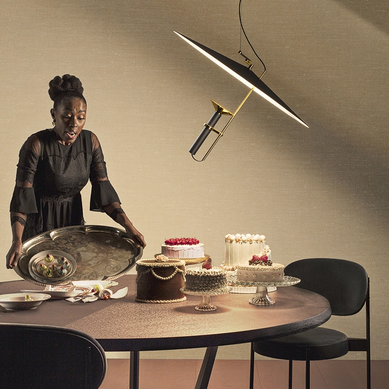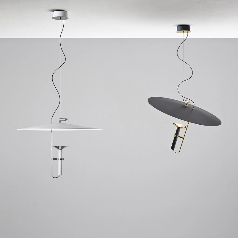 La suspension Luna de Stilnovo est subtile et légère, dotées de proportions minimalistes et d'une émission douce. La lumière est projetée sur un disque réflecteur pivotant, qui la diffuse à son tour sur le plan de manière confortable. Un système breveté d'équilibrage des pivots permet d'incliner facilement le disque et donc la projection de la lumière. La collection Luna comprend également le lampadaire Luna.