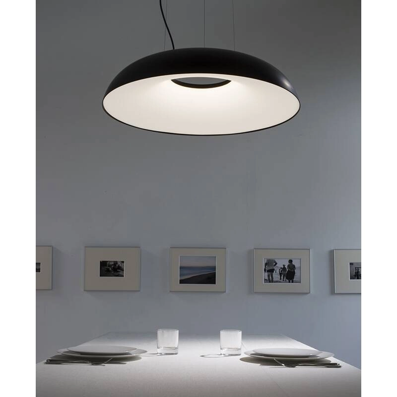 La source lumineuse LED de Maggiolone est soigneusement dissimulée par un diffuseur qui occupe toute la surface interne de l’abat-jour, ce qui assure une émission large, uniforme et non-éblouissante de la lumière.
