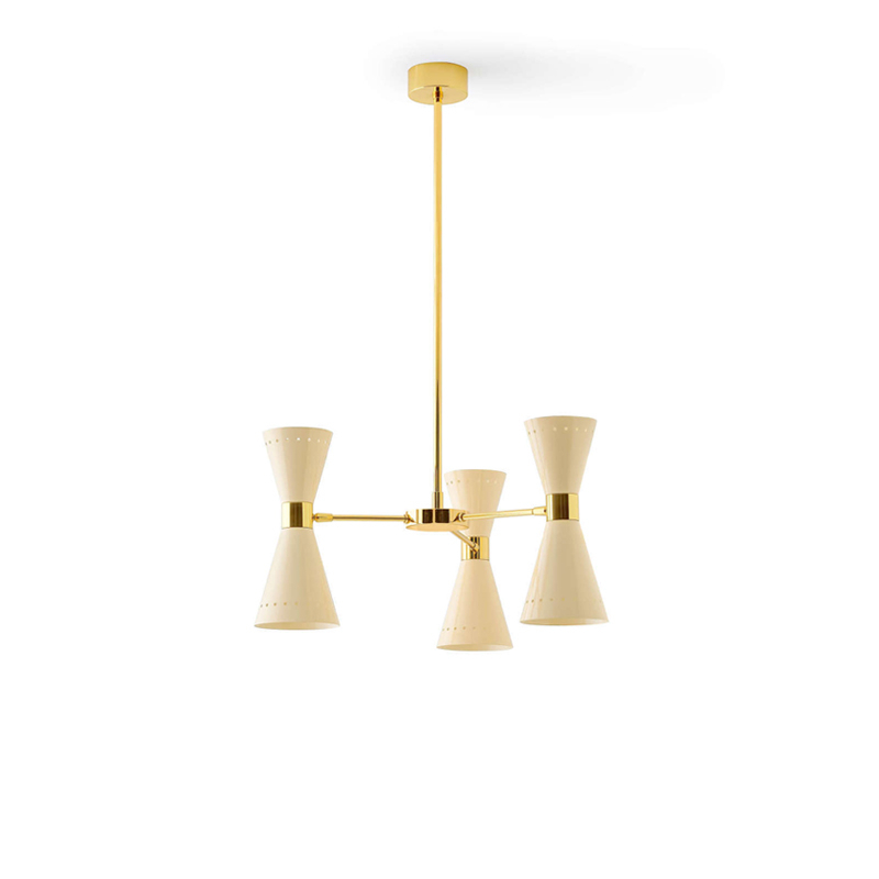 Megafono de Stilnovo est une suspension emblématique des années 1950 dotée d'une lumière directe et indirecte. L'abat-jour à double cône réglable de la suspension Megafono éditée par Stilnovo est associé à une tige en laiton précieux à dorure galvanique, pour éclairer avec une touche raffinée. La suspension Megafono est disponible en version 3, 6 ou 8 branches.