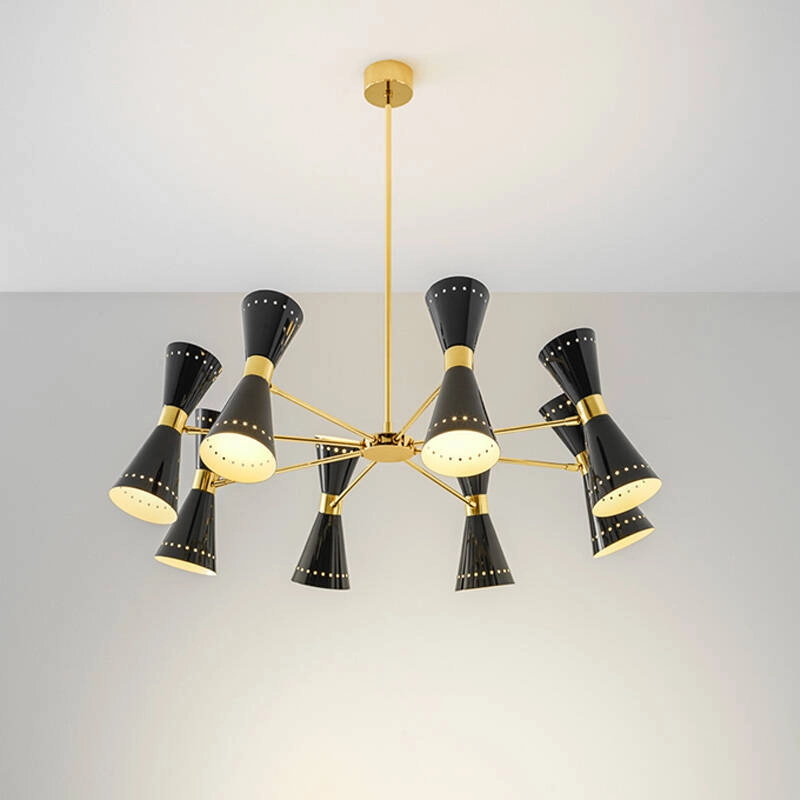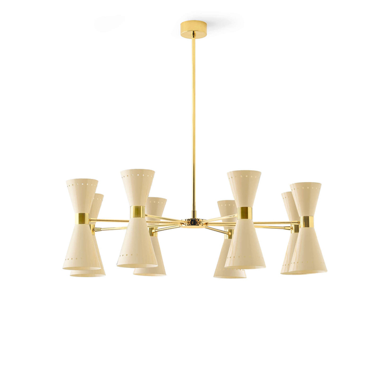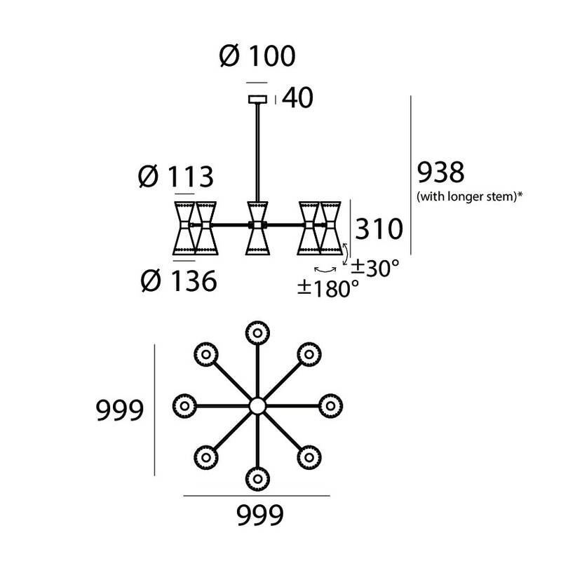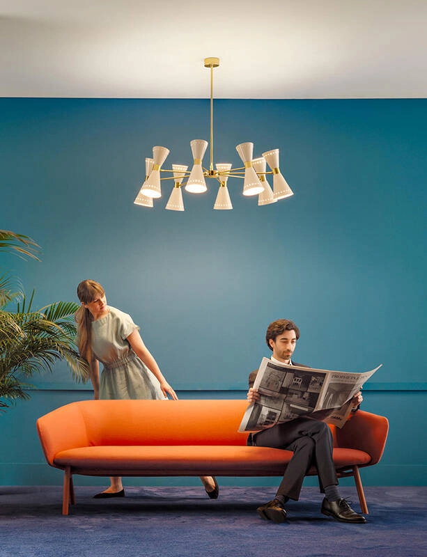 Megafono de Stilnovo est une suspension emblématique des années 1950 dotée d'une lumière directe et indirecte. L'abat-jour à double cône réglable de la suspension Megafono éditée par Stilnovo est associé à la tige en laiton précieux à dorure galvanique, pour éclairer avec une touche raffinée. La suspension Megafono est disponible en version 3, 6 ou 8 branches.