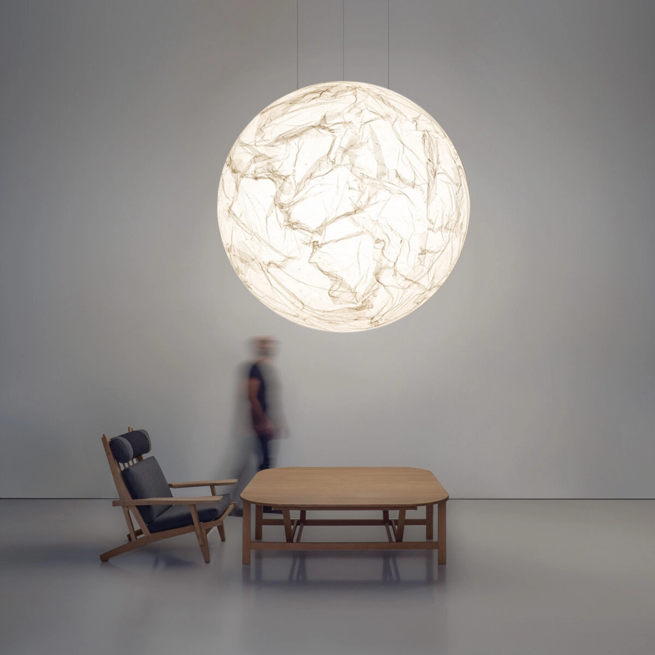 La collection de suspensions Moon, signée Davide Groppi, célèbre la lumière comme une matière poétique. Inspirée par l’éclat lunaire, chaque suspension se présente comme une sphère suspendue, réalisée en papier japonais, qui diffuse une luminosité douce et diffuse, semblable à un clair de lune capturé dans l’espace intérieur. Leur surface légèrement irrégulière, presque vibrante, enrichit la perception de la lumière et accentue l’impression de naturel. Suspendues seules ou en composition, les Moon instaurent une atmosphère silencieuse et contemplative, transformant un plafond en un véritable paysage céleste. Adaptées aussi bien aux espaces résidentiels qu’aux environnements publics – restaurants, hôtels, galeries – les suspensions Moon transcendent leur fonction pour devenir des présences sensibles, capables de redessiner l’espace par la seule intensité de leur lumière.