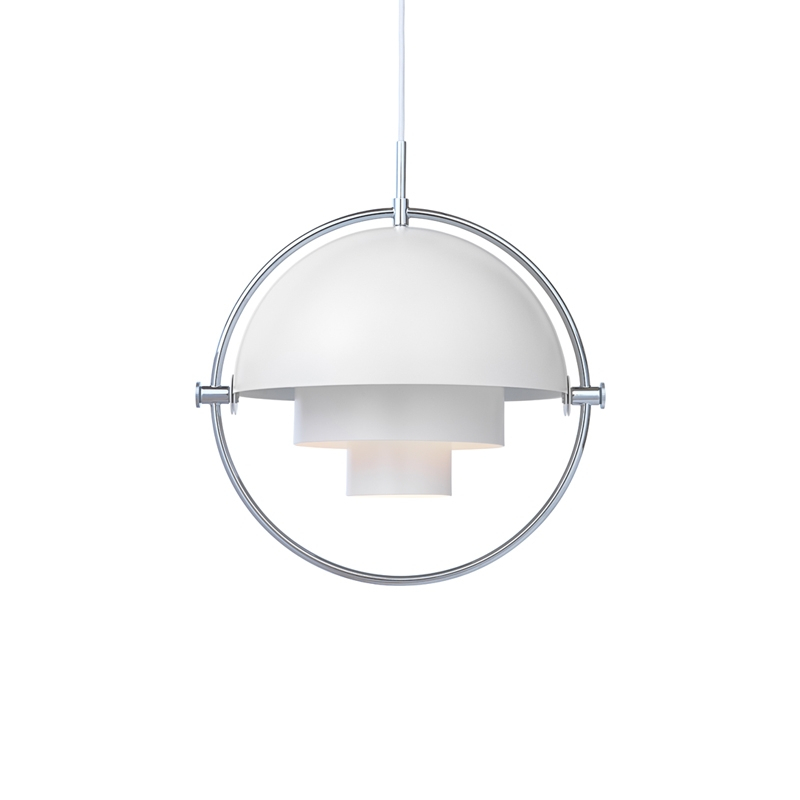 suspension Multi-lite, se trouve la coupole extérieure se composant de deux demi-sphères qui pivotent de haut en bas. Ces deux parties peuvent être orientées indépendamment l’une de l’autre. Cela permet à la lumière d’être orientée de différentes manière : en haut, en bas, ou de façon asymétrique.