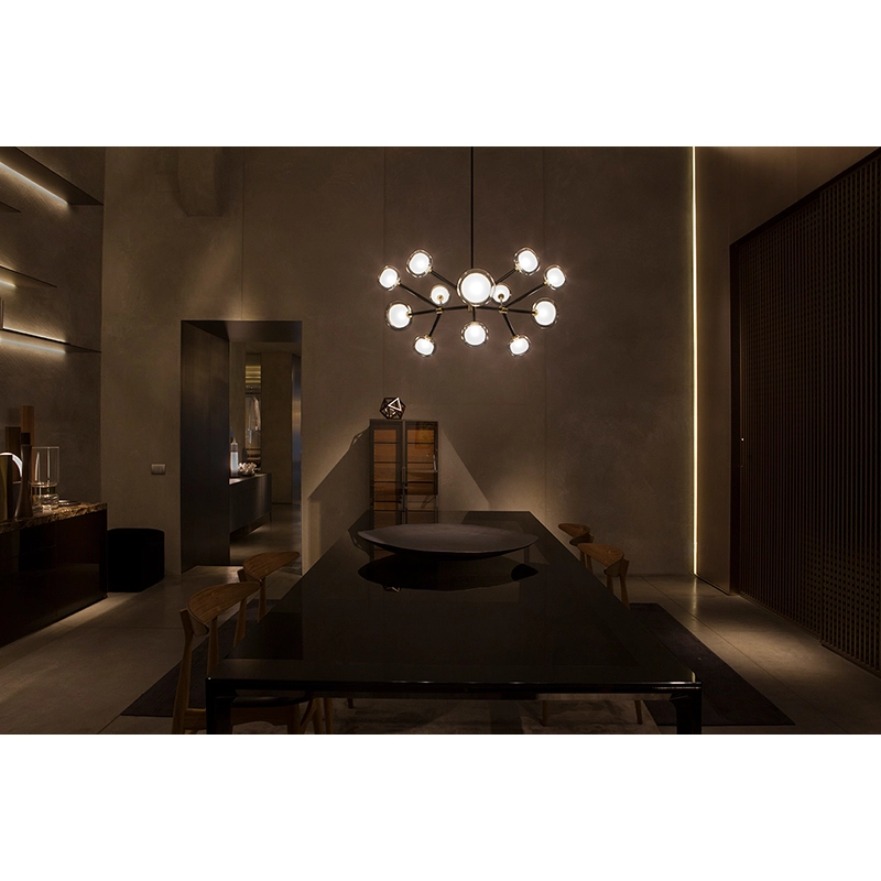 S'inspirant du design des luminaires des années 50, les luminaires de la collection Nabila de Tooy incarnent l'élégance et la sophistication, apportant une touche de raffinement à n'importe quel espace. La suspension Nabila 552.12 se distingue par ses globes lumineux en verre borosilicate à double paroi, disponibles dans diverses configurations, ainsi que par sa structure métallique revêtue de poudre époxy, agrémentée de détails en laiton brossé. Alliant le luxe à la sobriété, la suspension Nabila 552.12 incarne une véritable élégance en un seul élément. Avec Nabila, Tooy propose une large gamme de luminaires allant des somptueux lustres disponibles en tailles différentes aux versions plus petites conçues pour les tables de nuit, les lampadaires et les appliques murales.