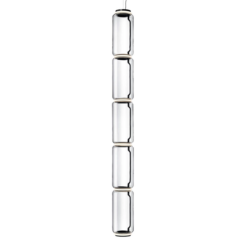Flos sont constituées d’un empilement de modules transparents, fabriqués artisanalement en verre soufflé. Les modules sont maintenus par une structure interne en métal laqué noir. Les formes géométriques se superposent donnant naissance à des constructions sculpturales qui offrent un équilibre extraordinaire entre les proportions et l’élégance des matériaux.