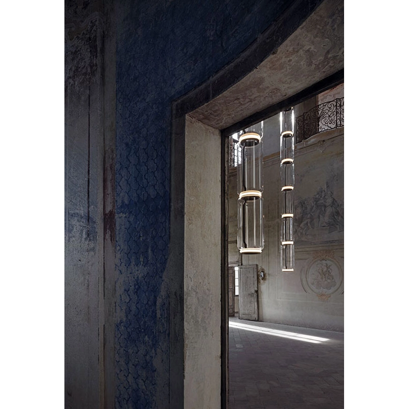 Noctambule devient l’acteur d’une scénographie lumineuse exceptionnelle. Les sources LEDS sont discrètement intégrées dans les jonctions entre les modules en verre. Ces anneaux lumineux scindent la silhouette longiligne et rythment l’espace. L’éclairage diffus se propage sur toute la surface du verre qui devient brillant. Designer réputé pour son épure et sa rigueur fonctionnelle, Konstantin Grcic signe la collection de luminaires