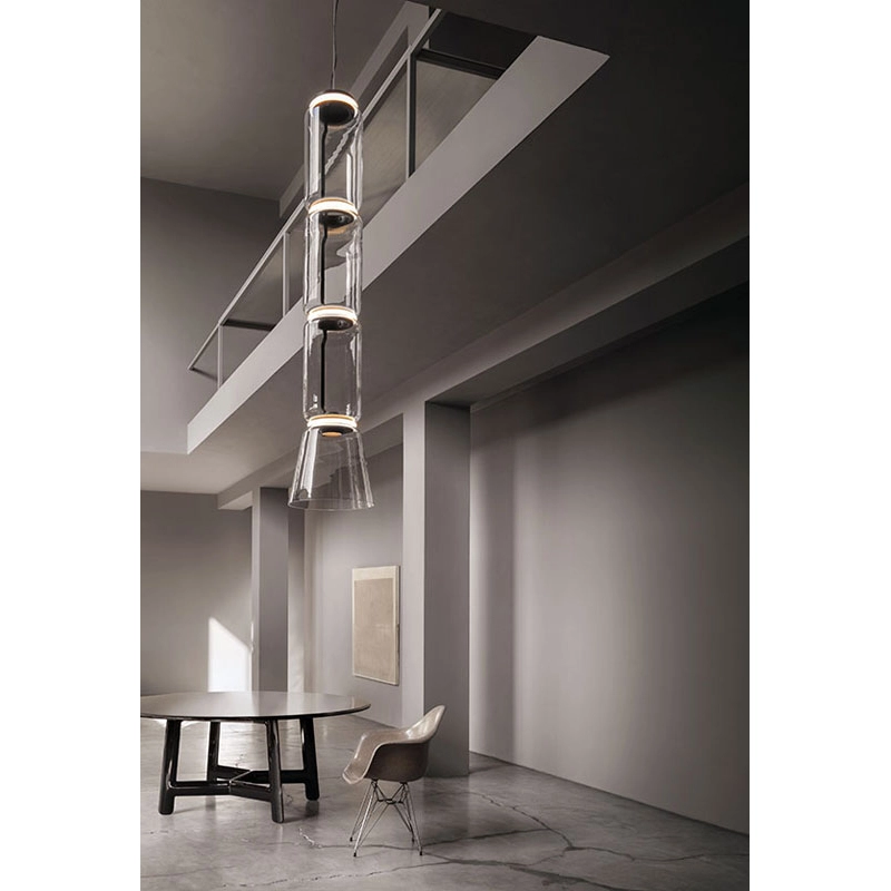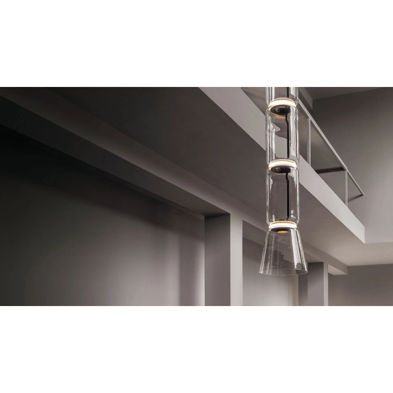Tels des noctambules, ces lampes sont de véritables oiseaux de nuit : presque invisibles le jour, elles se révèlent fascinantes la nuit… Durant la journée, Noctambule de Flos est un luminaire éthéré à la présence discrète malgré ses proportions imposantes. Une fois la nuit tombée, Noctambule devient l’acteur d’une scénographie lumineuse exceptionnelle. Les sources LEDS sont discrètement intégrées dans les jonctions entre les modules en verre. Ces anneaux lumineux scindent la silhouette longiligne et rythment l’espace. L’éclairage diffus se propage sur toute la surface du verre qui devient brillant. Designer réputé pour son épure et sa rigueur fonctionnelle, Konstantin Grcic signe la collection de luminaires Noctambule. On retrouve dans ce projet son appétit pour l’exploration de typologies inédites. Les lampes Noctambule de Flos sont constituées d’un empilement de modules transparents, fabriqués artisanalement en verre soufflé. Les modules sont maintenus par une structure interne en métal laqué noir. Les formes géométriques se superposent donnant naissance à des constructions sculpturales qui offrent un équilibre extraordinaire entre les proportions et l’élégance des matériaux.