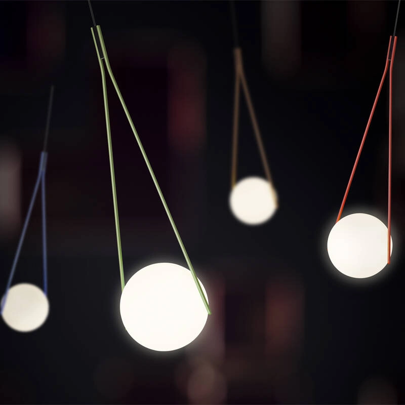 La suspension NomNom d'Odin Visser éditée par MOOOI, est une conception d'éclairage tout à fait moderne. Ce luminaire de taille modeste synthétise parfaitement l’art de l’omission, minimalisme qui renforce son caractère unique. Le diffuseur opaque et sphérique de NomNom est retenu en équilibre entre deux fines baguettes métalliques, presque invisibles, ce qui donne la sensation aérienne que la source lumineuse est suspendue dans le vide. En tant que luminaire autonome, il n'y a aucun moyen de contourner l'élégance ludique de la suspension NomNom, mais son effet est multiplié lorsqu’elle est accompagnée d’autres lampes, en bouquet ou alignées.