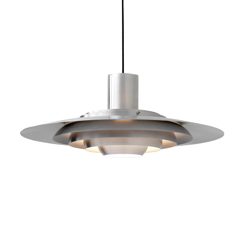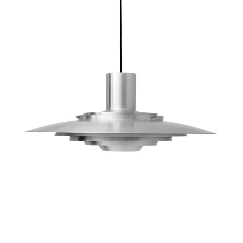 Dessinée en 1963 et rééditée par And Tradition, la suspension P376 est une déclaration sculpturale dans une silhouette contemporaine. Preben Juhl Fabricius (1931-1984) et Jørgen Kastholm (1931-2007) étaient deux architectes animés d’une mission mutuelle : celle de faire de la forme un pur dérivé de la fonction. Bien qu’ils se soient associés pendant moins d’une décennie, Kastholm et Fabricius ont laissé un héritage de travail, mis à l’honneur dans les musées du monde entier. Kastholm a été formé en tant que forgeron, et Fabricius comme ébéniste. Cet équilibre de perspectives leur a permis de définir une nouvelle sorte de prestige, ajoutant une facette d’élégance à l’actuel fonctionnalisme du Modernisme danois. Des formes élégantes, allongées, élancées, une symétrie simplifiée, et un mélange moderne de matériaux caractérisent leurs designs. Préservant l’authenticité du design original, optimisé pour émettre une lumière diffuse et non éblouissante, la suspension P376 est formée de cinq cercles concentriques qui se rejoignent et créent une ombre ouverte. Couronnée d’une pièce cylindrique qui dissimule l’ampoule et agit comme un support pour les éléments en métal qui forment les ombres, la lampe est proposée en deux finitions : aluminium brossé simple, ou doté d’un revers laqué blanc.