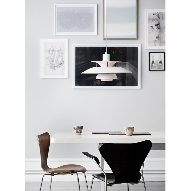 Dessinée en 1958 par Poul Henningsen pour Louis Poulsen, la suspension PH 5 tient son nom du diamètre de 50 cm de l’abat-jour principal du luminaire. À l’époque de sa création, personne ne se doutait que PH 5 finirait par incarner l’éclairage caractéristique de Poul Henningsen. La suspension se distingue par son éclairage 100 % anti-éblouissant, indépendamment de la source lumineuse employée et de la manière dont la lampe est installée. La suspension PH5 de Louis Poulsen émet une lumière dirigée vers le bas et vers les côtés et s’éclaire donc elle-même. Intemporelle, PH 5 continue d'égayer les intérieurs les plus modernes grâce à sa palette de couleurs.