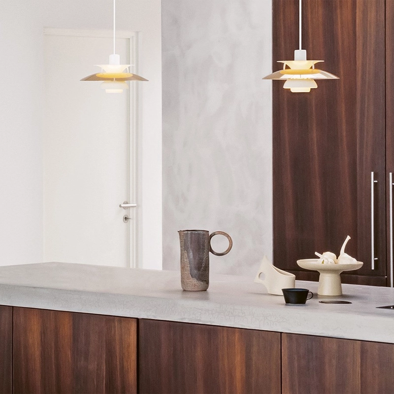 Dessinée en 1958 par Poul Henningsen pour Louis Poulsen, la suspension PH 5 tient son nom du diamètre de 50 cm de l’abat-jour principal du luminaire. À l’époque de sa création, personne ne se doutait que PH 5 finirait par incarner l’éclairage caractéristique de Poul Henningsen. La suspension se distingue par son éclairage 100 % anti-éblouissant, indépendamment de la source lumineuse employée et de la manière dont la lampe est installée. La suspension émet une lumière dirigée vers le bas et vers les côtés et s’éclaire donc elle-même. Intemporelle, PH 5 continue d'égayer les intérieurs les plus modernes grâce à sa palette de couleurs, tout comme PH 5 Mini. Cette suspension lancée en 2017 possède un abat-jour supérieur de 30 centimètres suivant les principes de Poul Henningsen. Ce premier redimensionnement de la célèbre suspension s’inscrit dans la volonté de Louis Poulsen d’accompagner la vie contemporaine et créative.