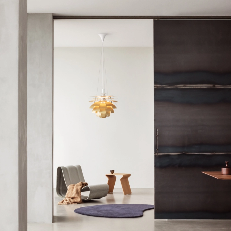 Dessinée par Poul Henningsen il y a plus de 40 ans, la suspension PH Artichoke est considérée aujourd'hui comme un classique du design. La structure est réalisée avec douze arches d'acier. Sur cette structure, Poul Henningsen a placé 72 feuilles de cuivre, et six lames sur chaque rangée. Chaque étage étant échelonné par rapport à la précédente, les 72 feuilles peuvent se couvrir l'une et l'autre. Cette conception permet une bonne vue du luminaire à partir de n'importe quel angle sans voir directement la source lumineuse située au centre de la suspension. Les PH Artichoke ont été développées à l'origine pour un restaurant de Copenhague nommé le Pavillon Langelinie, où elles peuvent encore être admirées aujourd'hui.