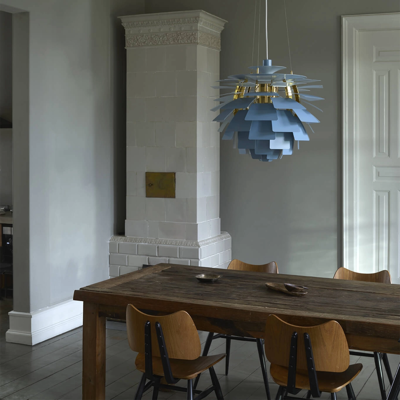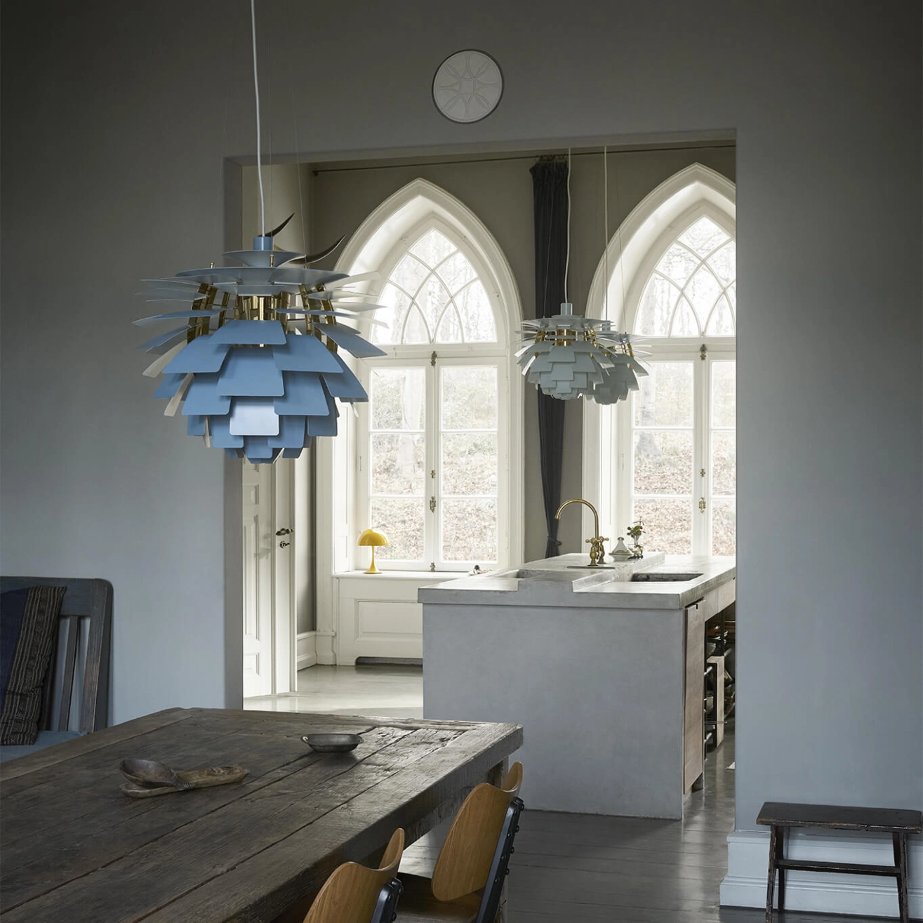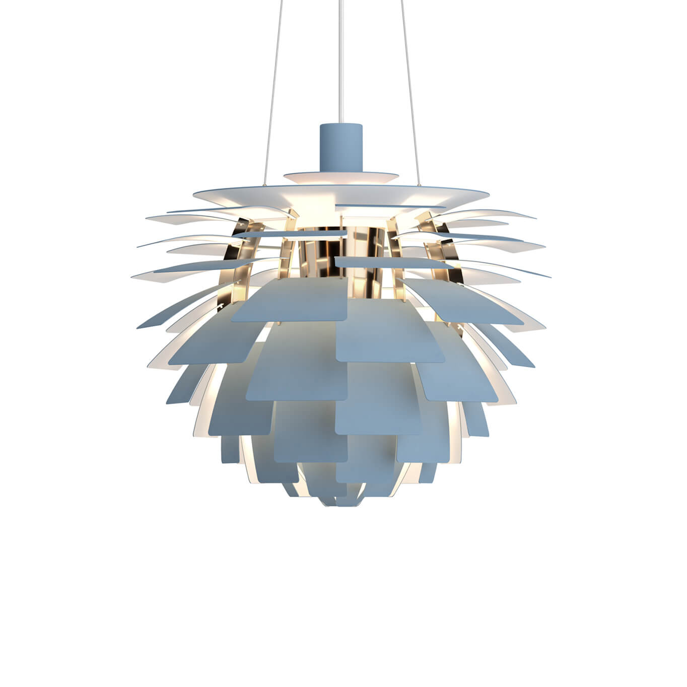 Dessinée par Poul Henningsen il y a plus de 40 ans, la suspension PH Artichoke est considérée aujourd'hui comme un classique du design. La structure est réalisée avec douze arches d'acier. Sur cette structure, Poul Henningsen a placé 72 feuilles de cuivre, et six lames sur chaque rangée. Chaque étage étant échelonné par rapport à la précédente, les 72 feuilles peuvent se couvrir l'une et l'autre. Cette conception permet une bonne vue du luminaire à partir de n'importe quel angle sans voir directement la source lumineuse située au centre de la suspension. Les PH Artichoke ont été développées à l'origine pour un restaurant de Copenhague nommé le Pavillon Langelinie, où elles peuvent encore être admirées aujourd'hui.