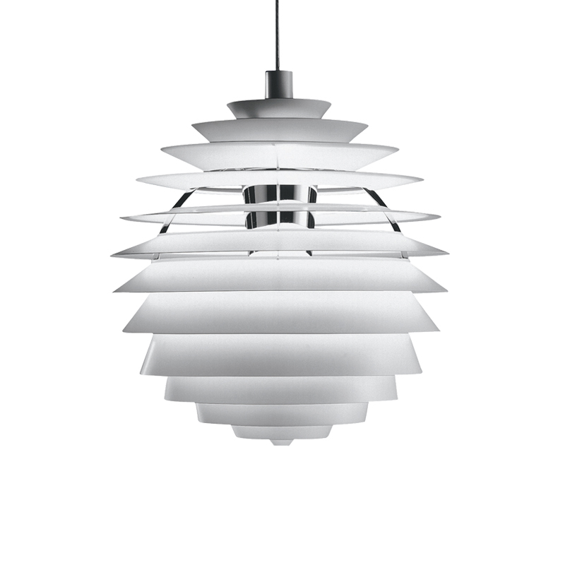 PH Louvre a été conçue par Poul Henningsen pour l’église adventiste de Skodborg, au Danemark, en 1957. La suspension en forme de globe est composée de 13 abat-jour montés sur quatre supports. Il s’agit d’une version simplifiée d’un luminaire plus ancien dessiné par Poul Henningsen en 1942, la Spirale. Edité par